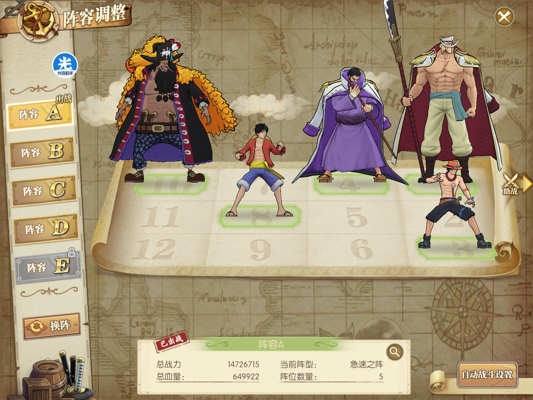 艾斯:前排中断加反伤。推荐肉装,堡垒套就很好。艾斯不缺伤害,越打火拳和奥义伤害越高,4层被动的怠战卡普都直接秒。艾斯可以堆肉,但千万别堆闪避,因为他的反伤也是很高的输出,而触发条件就是敌方必须打到他的盾上。三觉路飞:强烈建议高命中。方案一,路飞不进奥义延展,全程普通状态,只吃单体伤害,在艾斯后面,并且配合艾斯每次都能反攻晕人。方案二,自己路飞速度够快能站住,就进入奥义延展,反攻移除人。(注意别被连续AOE挂s)