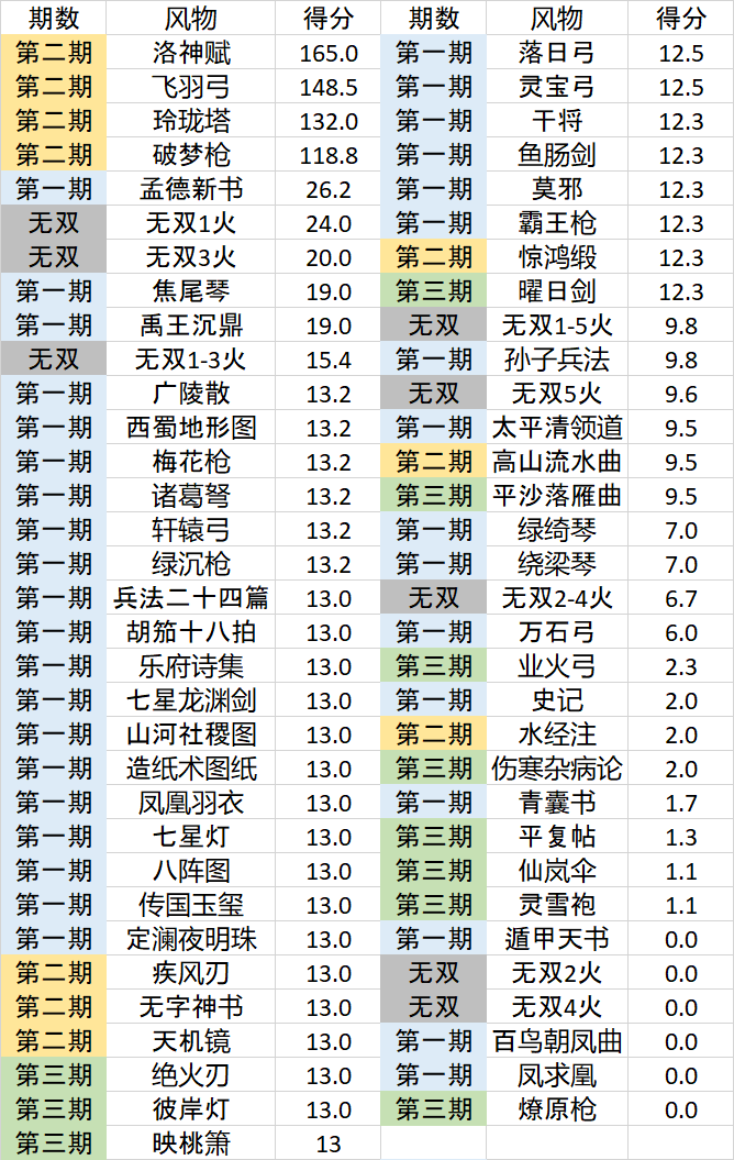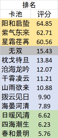 【结论1】对火烧来说风物的优先级为:怒气卡池 >> 无双1-3火 >> 沧海枕戈 >> 其他第一赛季卡池 >> 所有第三赛季卡池