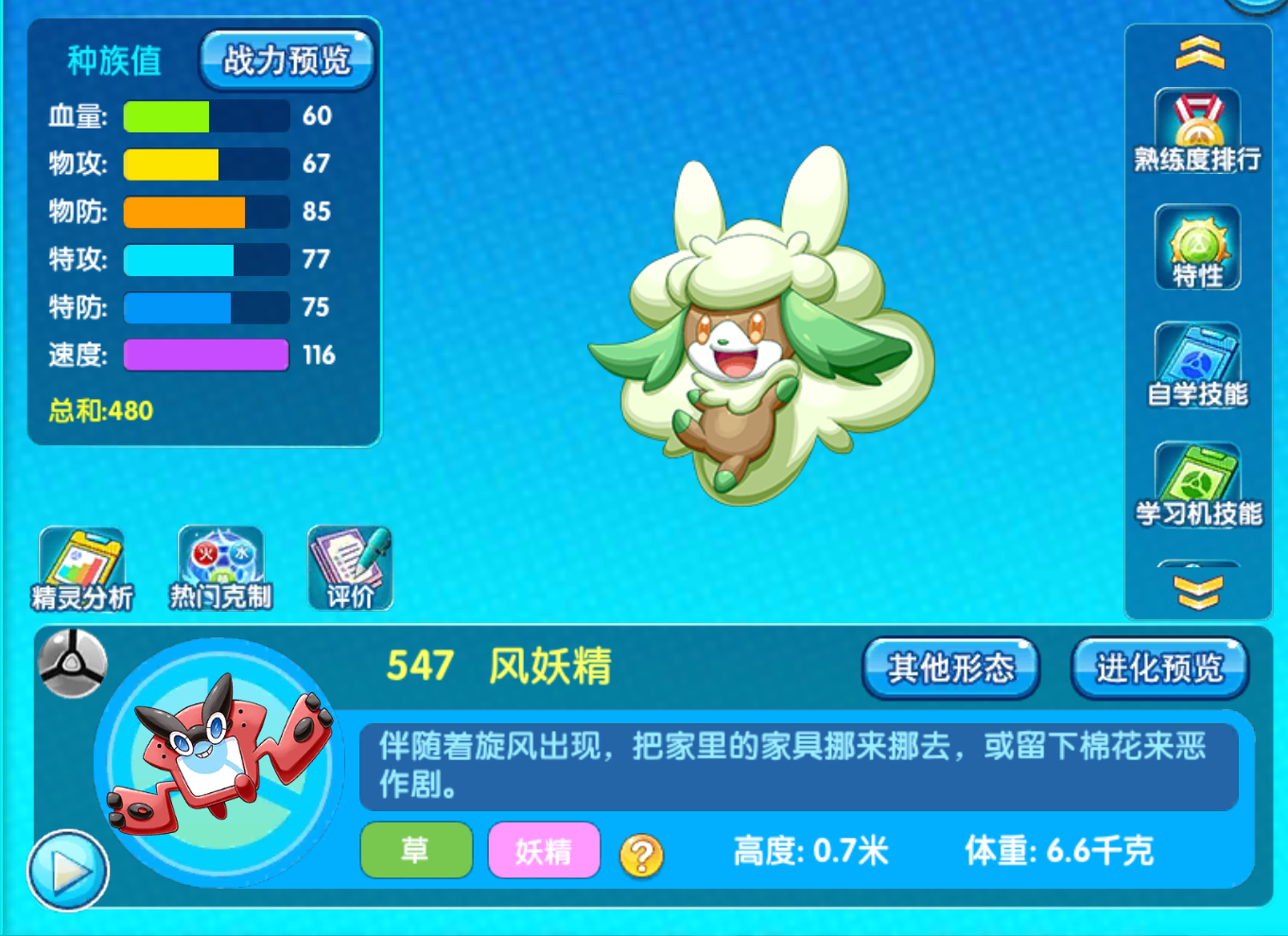 精灵配置说明:这应该是我写过所有精灵配置里面最简单的一个,因为是前期嘛,而且这个精灵由于会强攻,所以血量越低越好,并且在前期抓住就能用性格和努力都不需要添加,等级越低越好,更简单的是,这个精灵抓住就是五级,因为沙狐乐园里面的精灵抓到手之后,自动判定就是五级,我们需要做的,就是抓住木棉球之后进化然后学习个强攻技能就好了