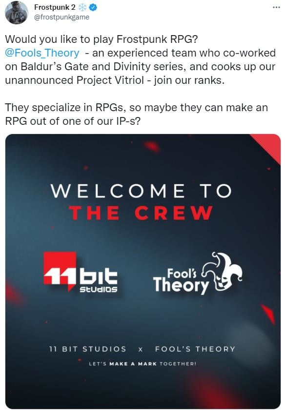 近日,11Bit工作室通过《冰汽时代2》官方推特宣布,Fool's Theory团队将加入其工作室,并暗示团队或正在开发一款11bit旗下IP的RPG游戏,不排除冰汽时代背景的RPG游戏。