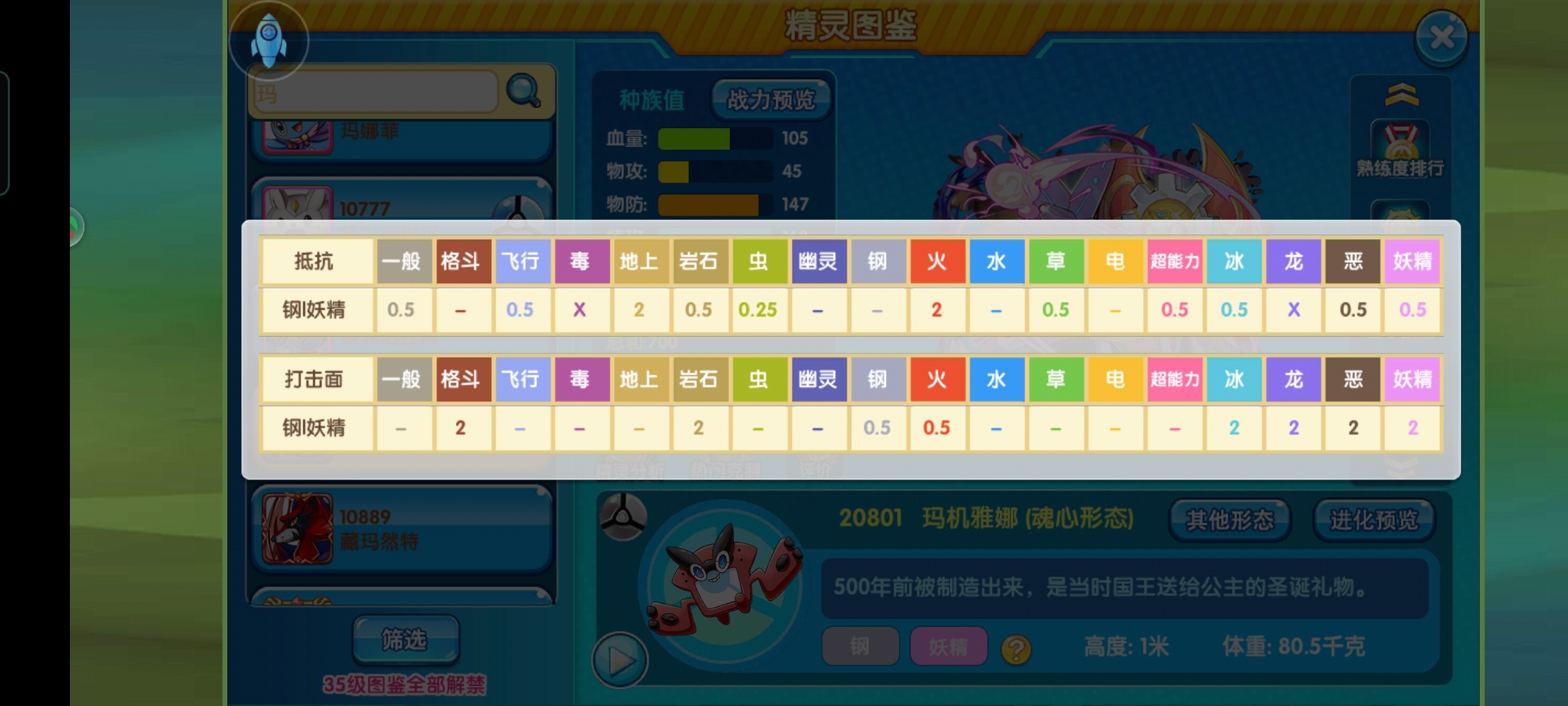玛基亚娜属性为钢+妖。一般,飞,岩,草,超,冰,恶,妖八个两倍抵抗,虫一个四倍抵抗,还有毒,龙两个免疫(十八个属性抵抗十一个,就问还有谁)。弱点的话,地火两个两倍弱,没有四倍弱。虽然相对抵抗面来说,打击面也是不俗,有格斗,岩,冰,龙,恶,妖五个双倍打击面。