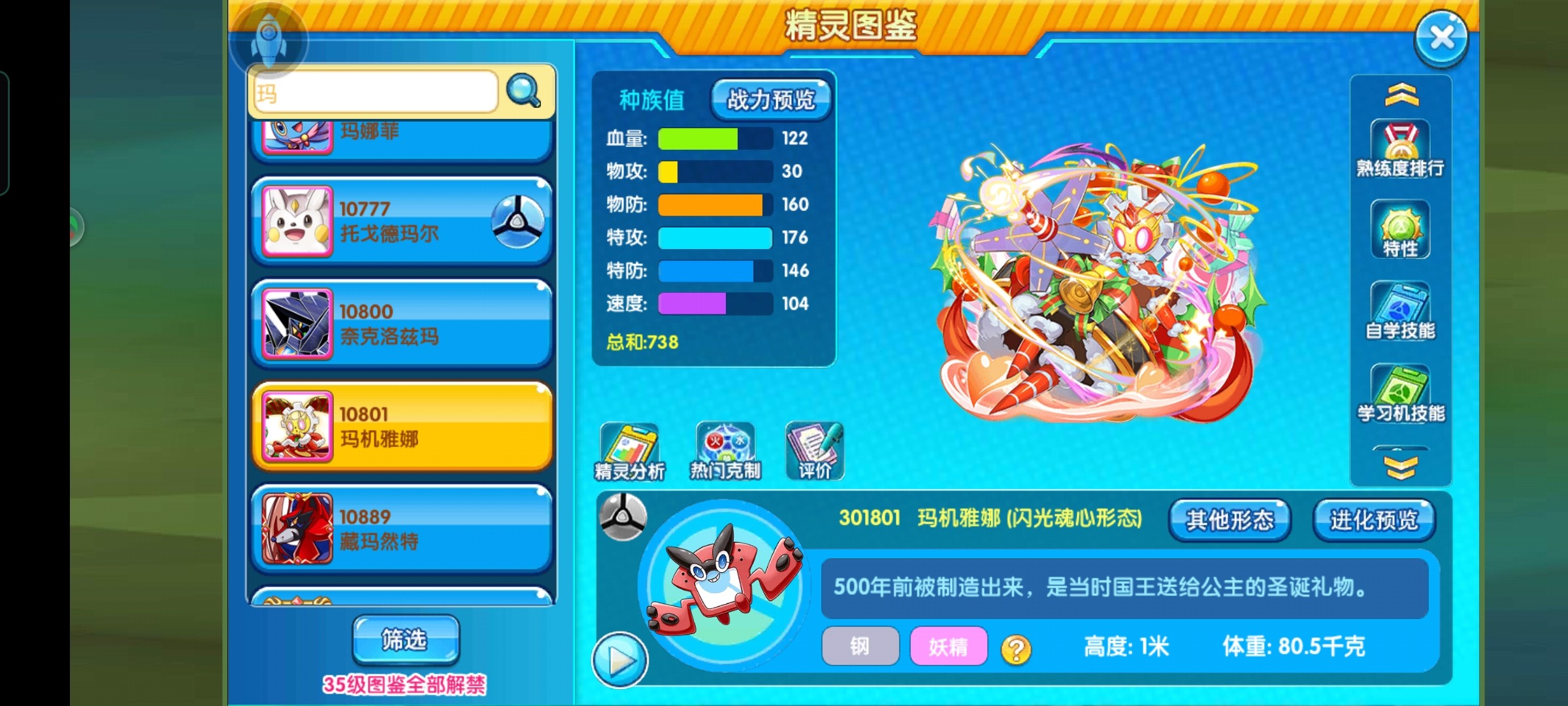 普通的和闪光面板差距还是有些大,闪光种族总计738,普通是700,有效种族也差别比较多,所以主要以闪光作为介绍,闪光去掉物攻30有效种族718,实属不俗。血量也有122,速度104相对于目前环境来说算是比较一般,但是强大的双抗加上优秀的属性让它可以成为了当前版本最优秀的肉盾之一。同时176的特攻值也决定了她不仅仅能抗伤害,而且反制力也极强,双本输出不俗,有高额伤害技能。
