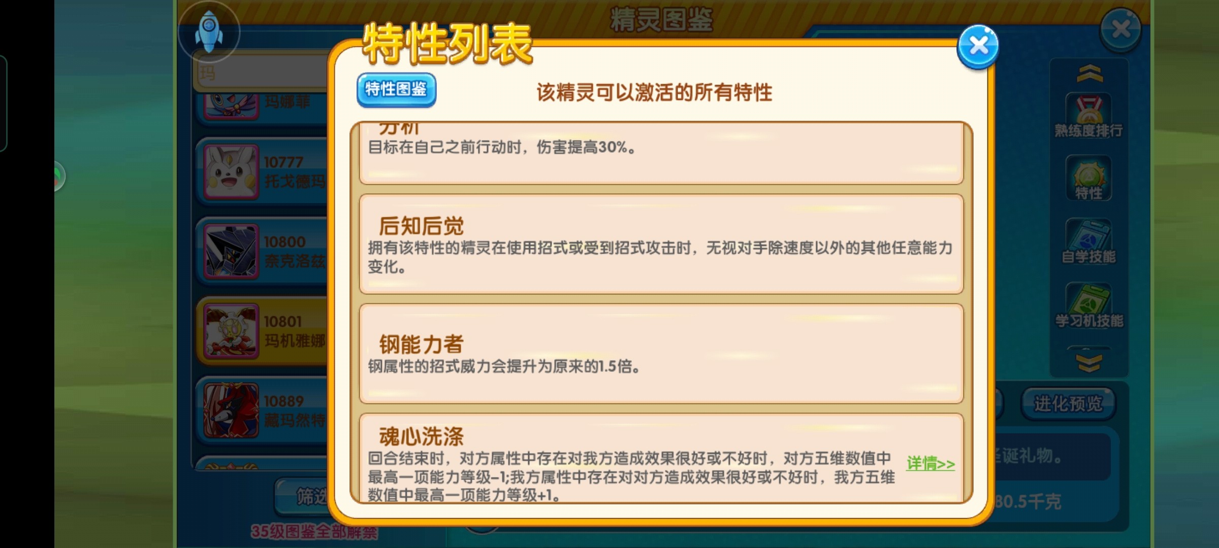 特性:原来主要特性是后知后觉,玛基亚娜单作为盾宠玩,开这个特性还是很舒服,不怕主流的强化宠,尤其是目前版本一些激斗宠,对他们克制很大,所以开这个特性也可以。