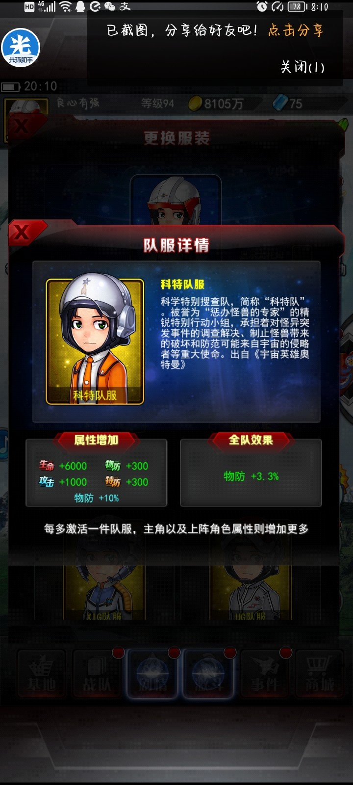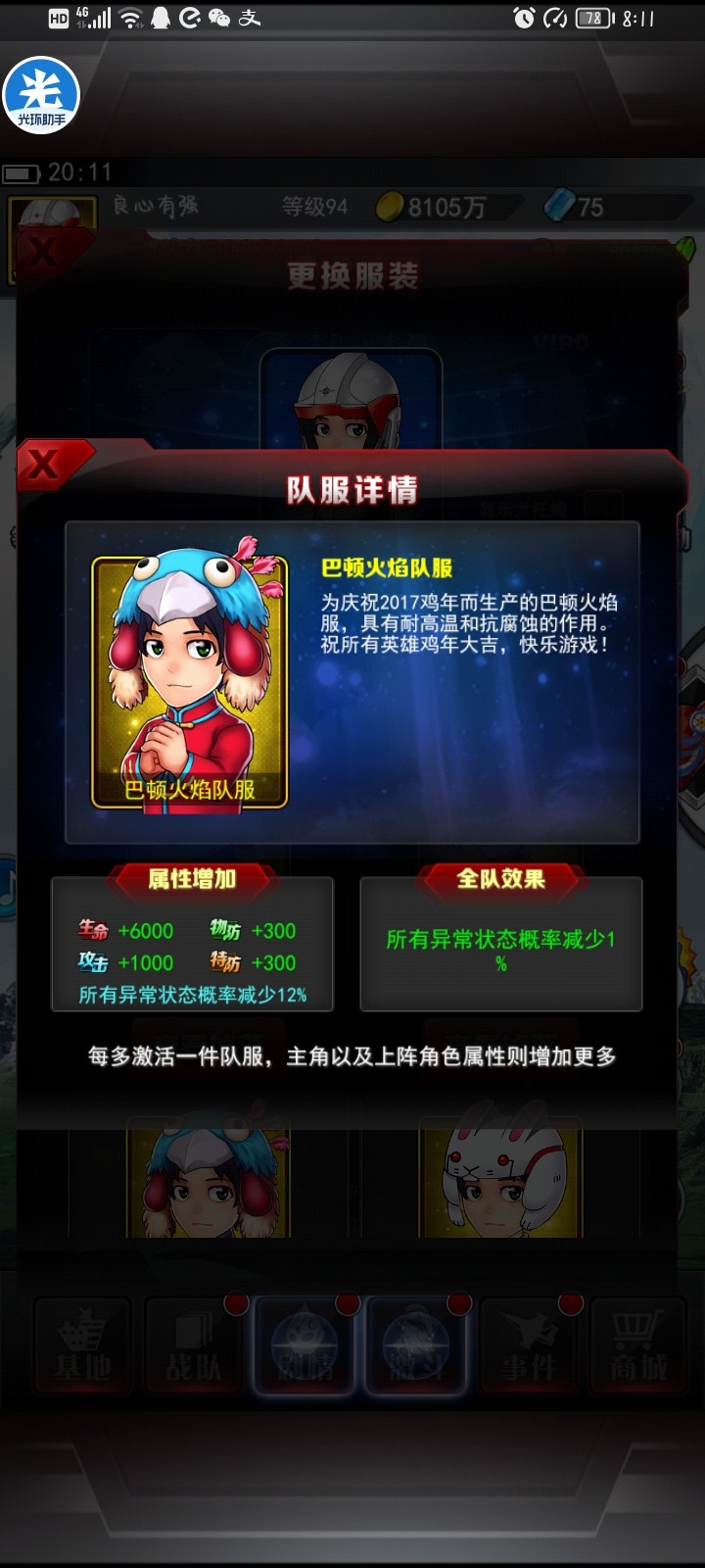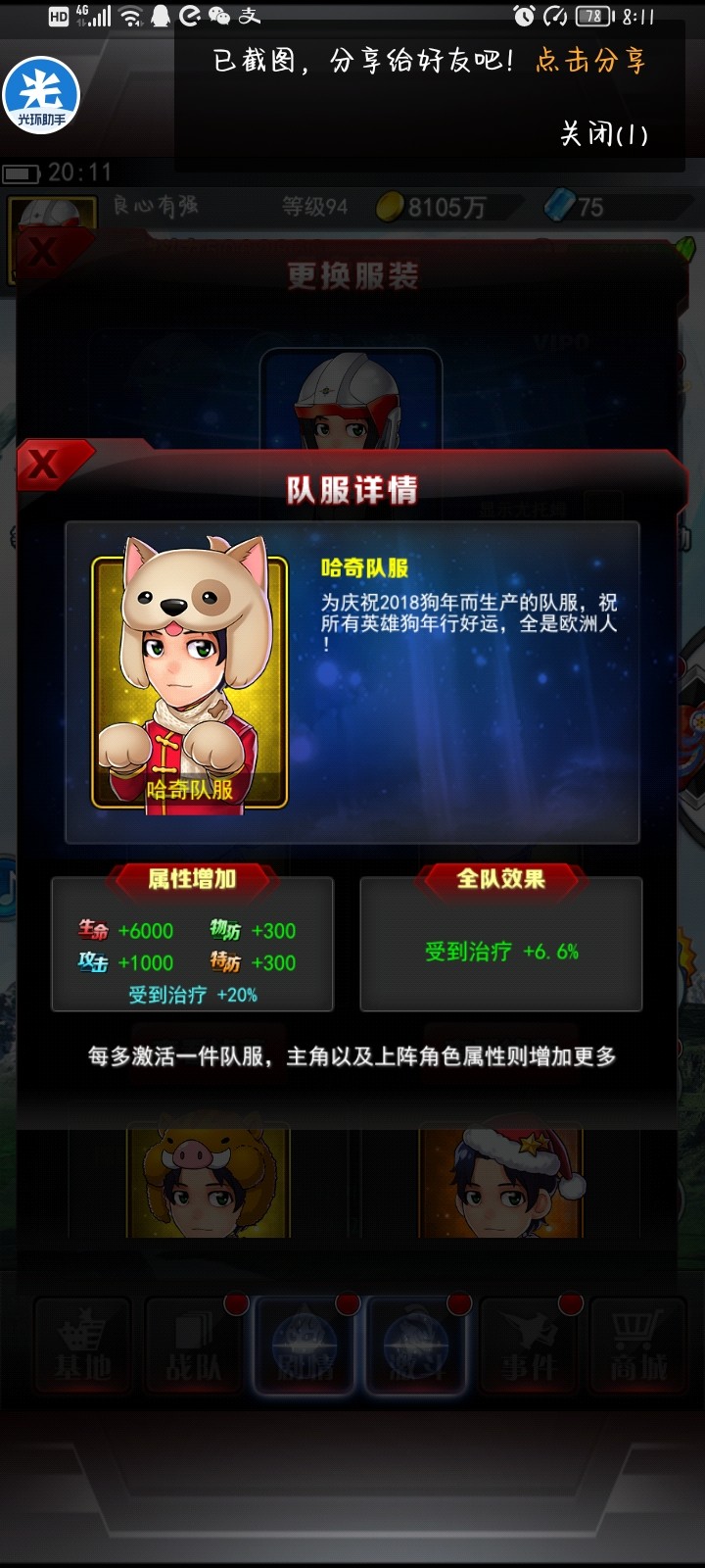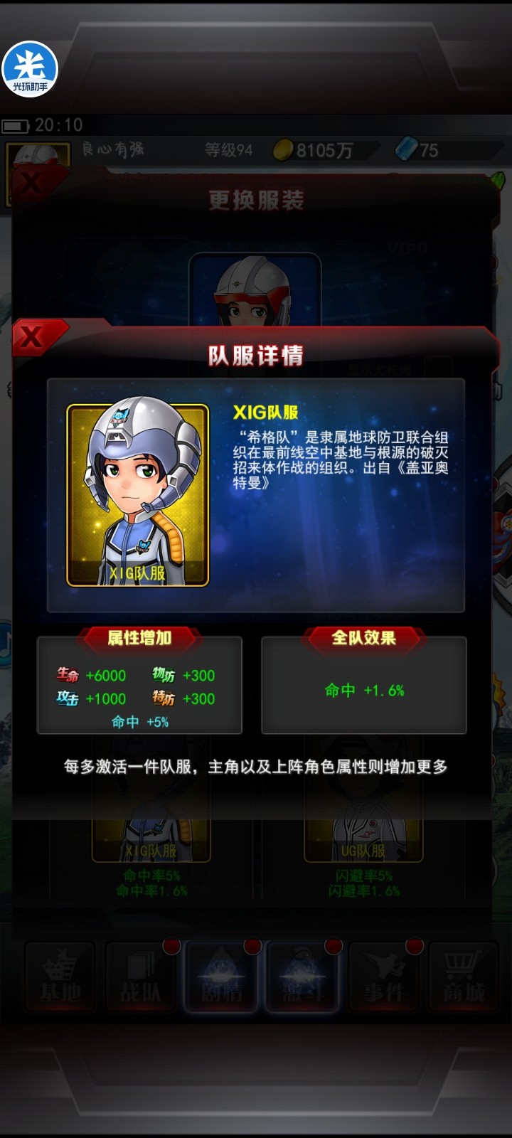 当前的队服大家都不可能不知道,每多一件这应有的效果就增加,就是那些。攻击呀,闪避呀,等防御力之类的效果,一般的人都不会管那些,所以凑齐全部队服是少之又少的,因为他们并没有发现其中的增幅效果,或者又是说征服幅度太少了,但是大佬们都非常重视这些,有些大佬并不是因为他们氪金,而是他们注意每一个细节,再加上他们充钱所获得的对付,所以增幅效果有很大的提高。