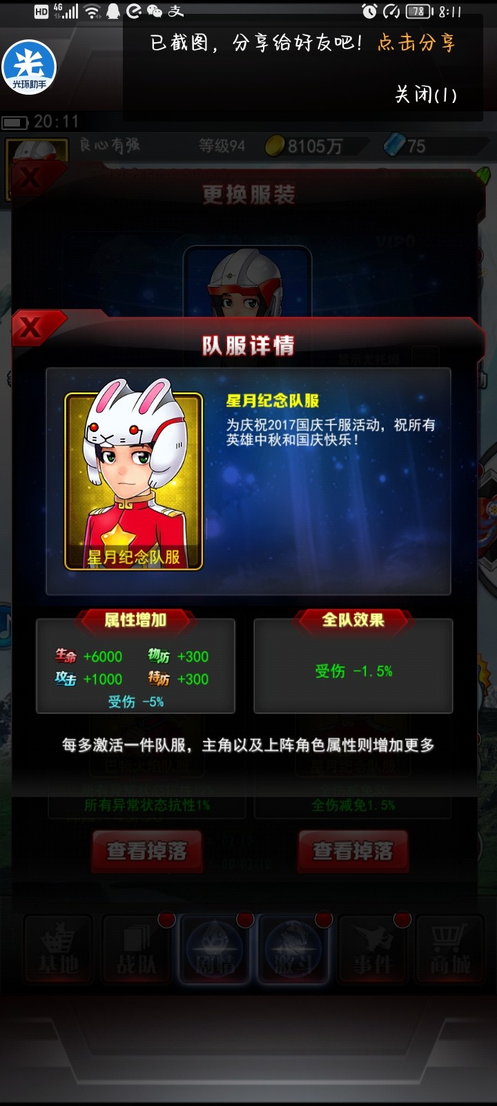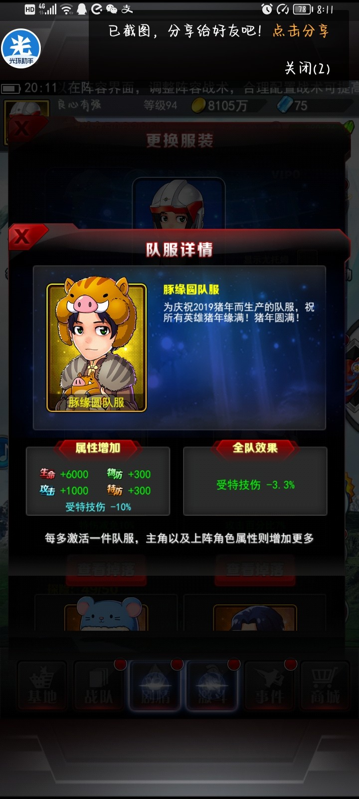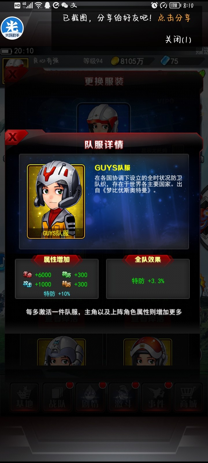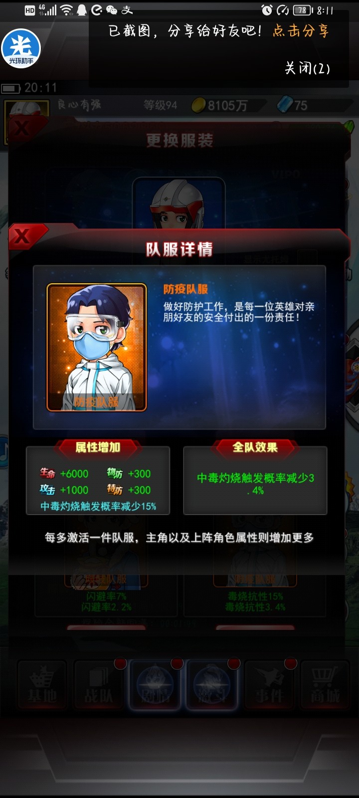当前的队服大家都不可能不知道,每多一件这应有的效果就增加,就是那些。攻击呀,闪避呀,等防御力之类的效果,一般的人都不会管那些,所以凑齐全部队服是少之又少的,因为他们并没有发现其中的增幅效果,或者又是说征服幅度太少了,但是大佬们都非常重视这些,有些大佬并不是因为他们氪金,而是他们注意每一个细节,再加上他们充钱所获得的对付,所以增幅效果有很大的提高。