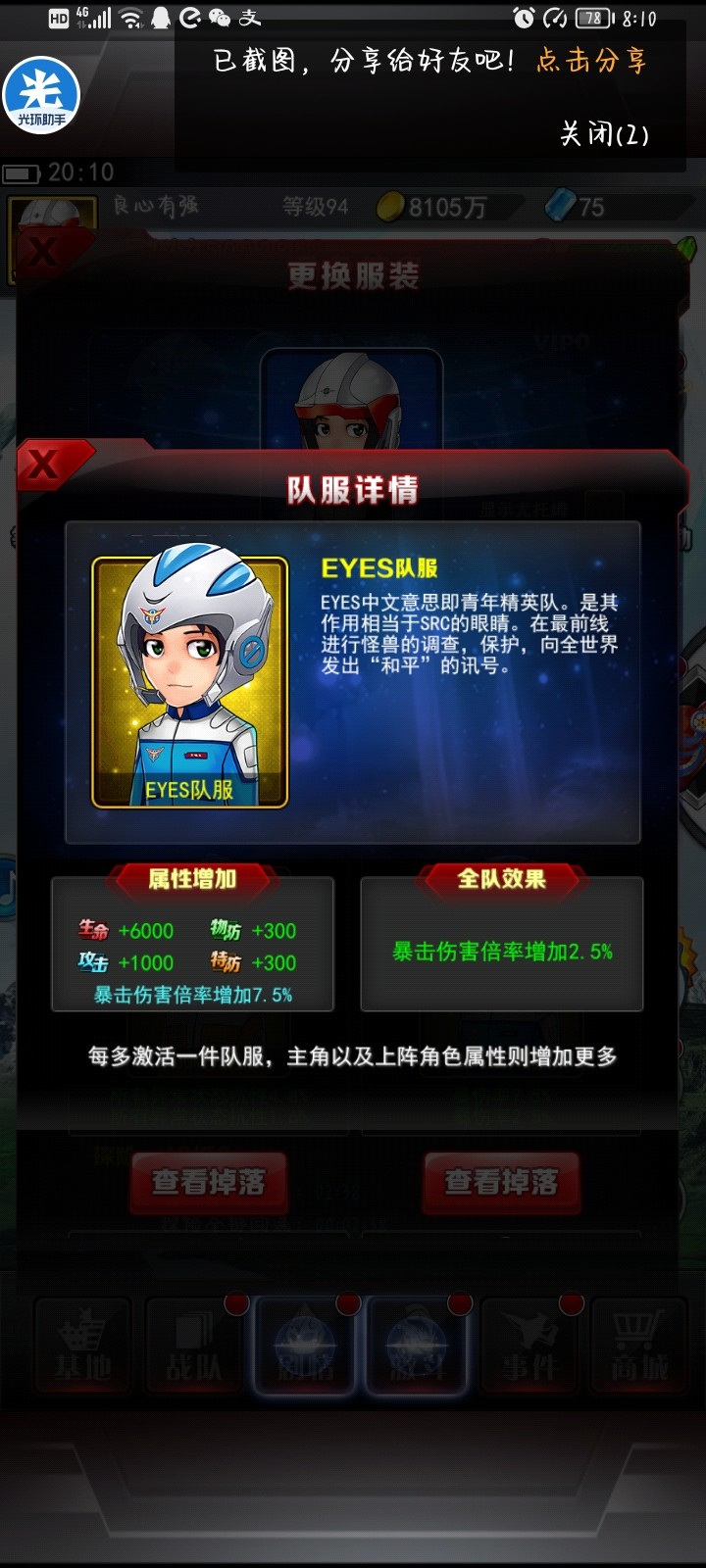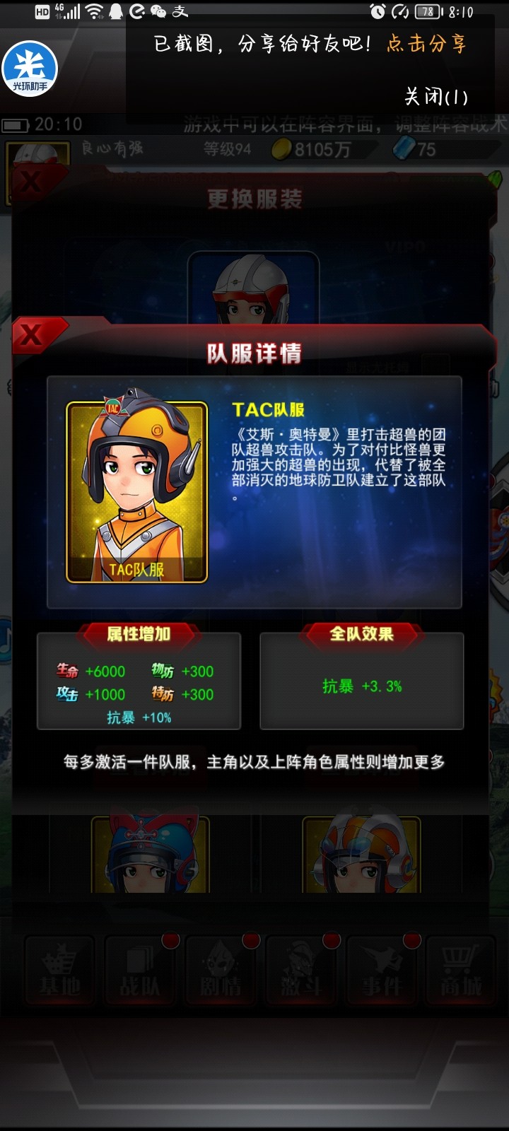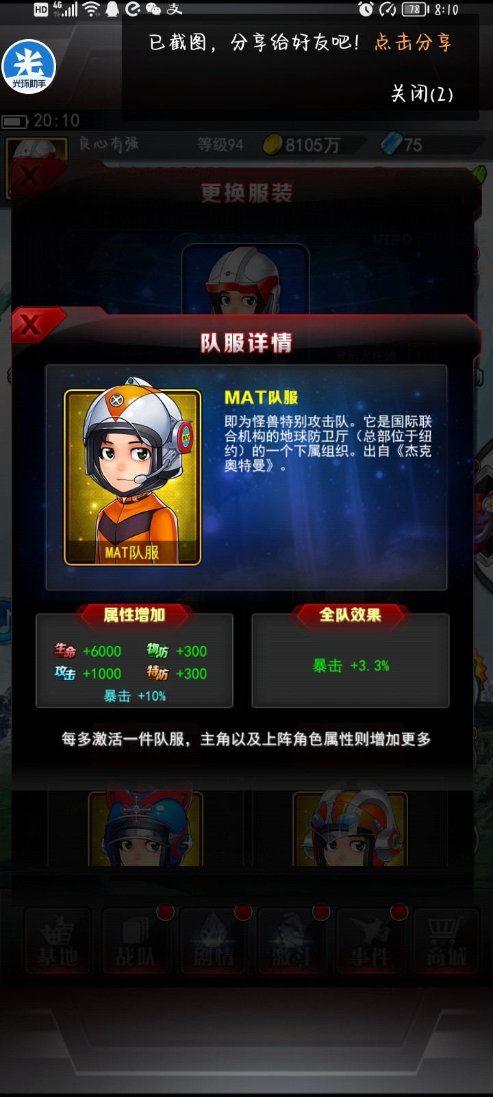 暴击加成,如果获得这件队服,可以提高暴击,在光之商城可以限购一件,但是要参加宇宙擂台,只有一次机会,所以最好是选这个,相当于白嫖。