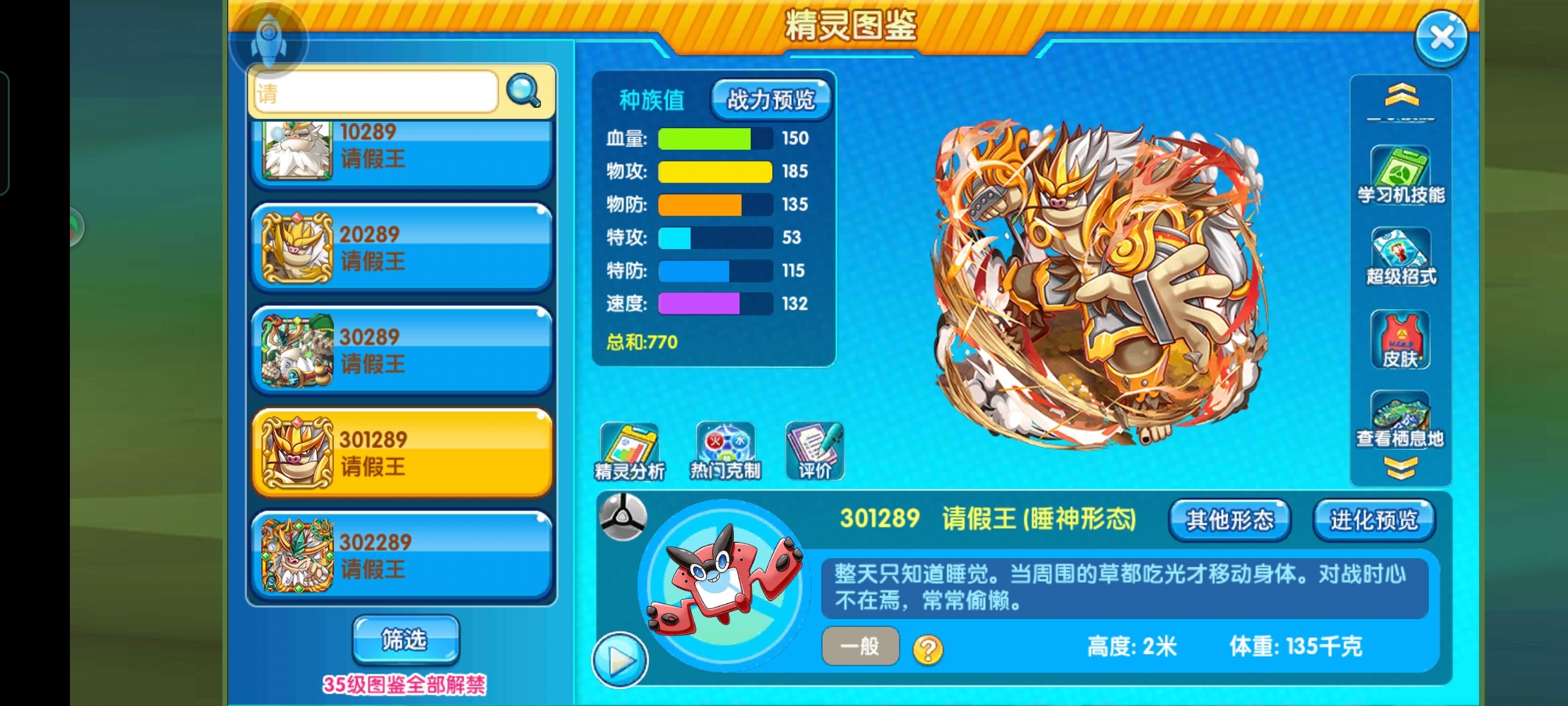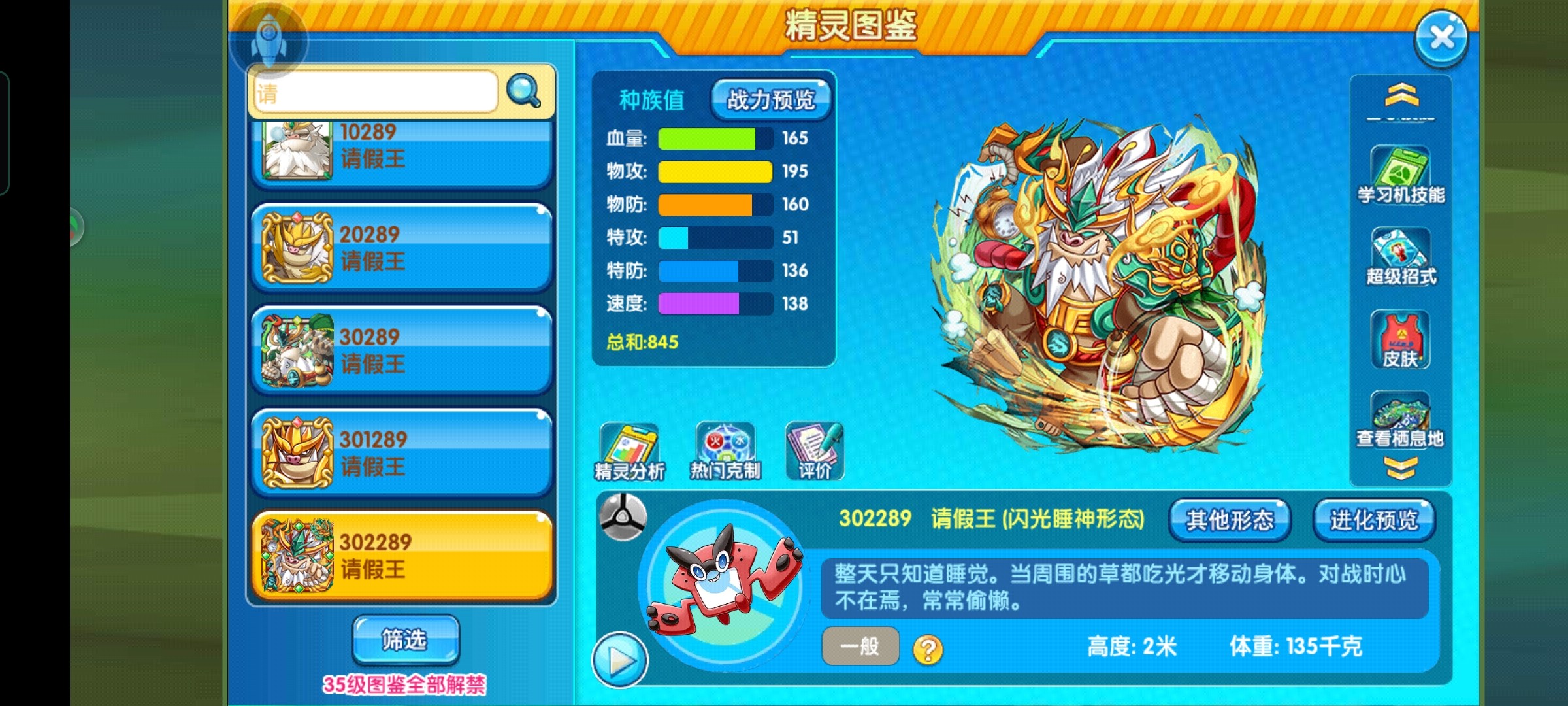 请假王普通比闪光差距很大,毕竟闪光是2888级别的,也可以理解,请假王拥有着较高的血量和物攻,双抗也足够,特攻只有五十过点,极大的给有效种族腾出了位置,而且请假王也有比较高的速度,这个分配可以吊打很大部分神兽的种族值,可以说是能抗能打。
