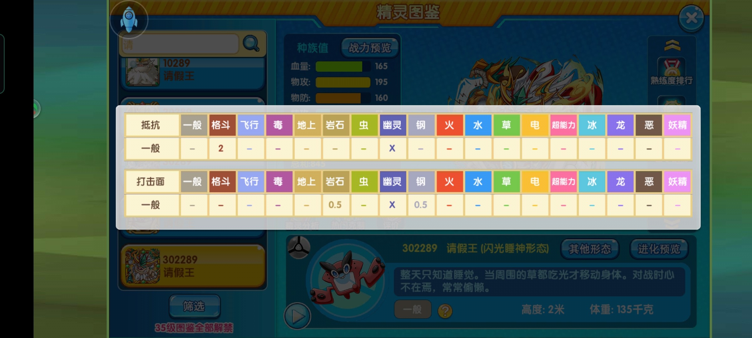 请假王是一只单普通系精灵,只有一个弱点格斗系,但是也没有抗性,没有克制系,打击面还盲幽灵系,不过这对请假王来说问题不大,谁叫人家特性出色,学习面广,多种威力不俗的属性搭配,在PVP中还是占有一定优势。