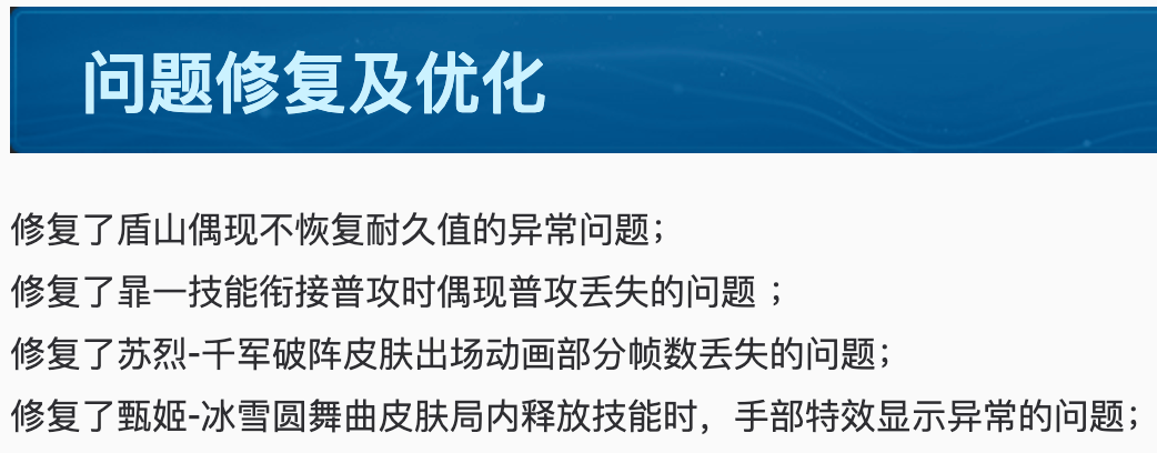 此次BUG修复中盾山时不时会出现不恢复耐久的情况得到了修复,还有新英雄暃的一技能衔接的普攻时不时会丢失的情况也一同得到了修复,其他两个是优化皮肤的动效。