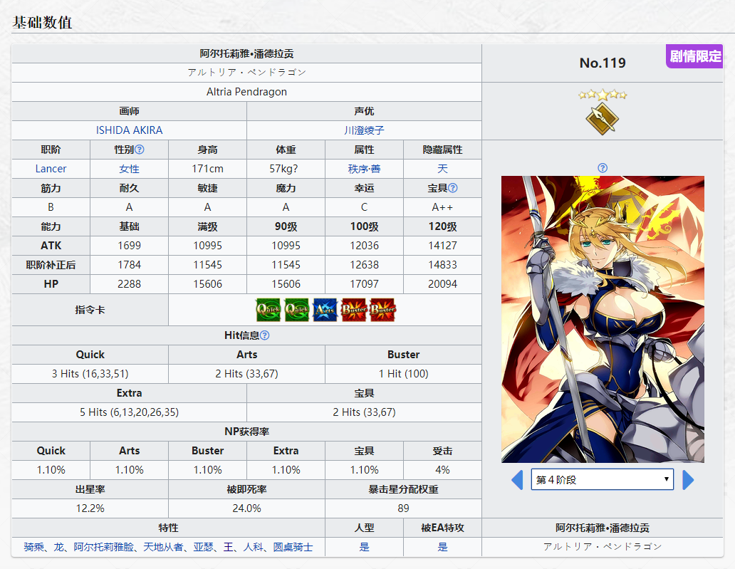 从者基础NP率为1.10%,指令卡配卡为二红一蓝二绿,红卡1hits、蓝卡2hits、绿卡3hits、EX卡5hits,从者实战指令卡NP率比较低,虽然基础NP率有1.10%,但是白枪呆蓝卡只有一张,所以导致白枪呆实战三蓝连携概率比较低,一张蓝卡打NP也不太够(但白枪呆有50NP自充,宝具后置回复20NP,周回很少靠指令卡回收NP,所以在周回还是很好用的)。