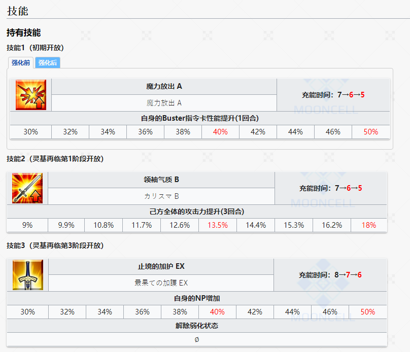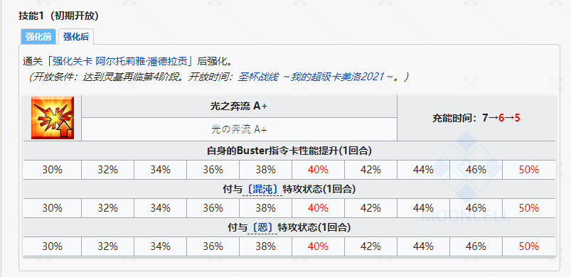 未来“圣杯战线”时候一技能强化之后改为「光之奔流 A+」,效果为赋予自身一回合30%~50%红魔放+一回合30%~50%「混沌」特攻+一回合30%~50%「恶」特攻。