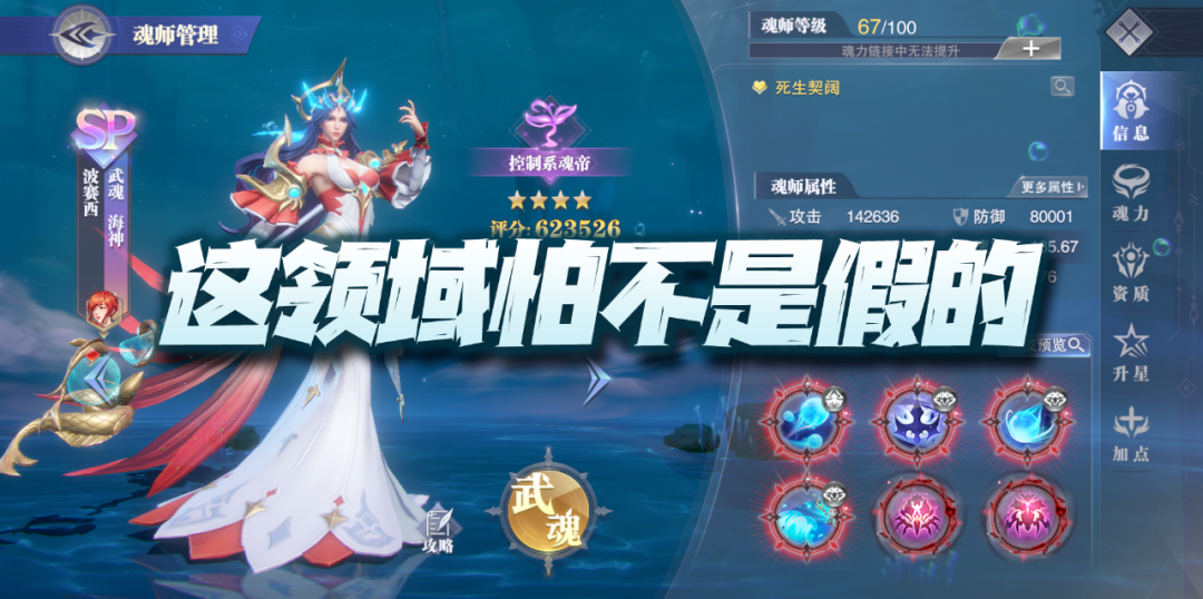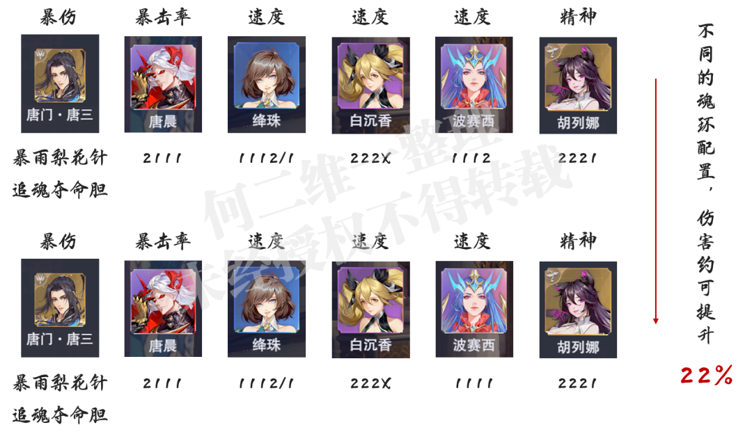 所以大家的波赛西练度并不是非常高的话,建议还是可以选择1111魂环配置,其实操作难度也并不大,只需要过程中择机放一次4-1技能即可,其余时间锁定普攻即可,和1112魂环配置的全程锁定4-2技能相比,并不会麻烦多少。此外【海神领域】目前在唐晨暗器队中的效果不如4-1【沧浪横流】,同时在猫队中又不能带【海神领域】,所以维一真心是不知道这个领域的就业环境到底在哪,至少目前使用率最高的两个长图打伤害队伍基本上都会优先选择1111魂环配置,或许也只有巨佬的2222魂环配置才能带的动【海神领域】吧......