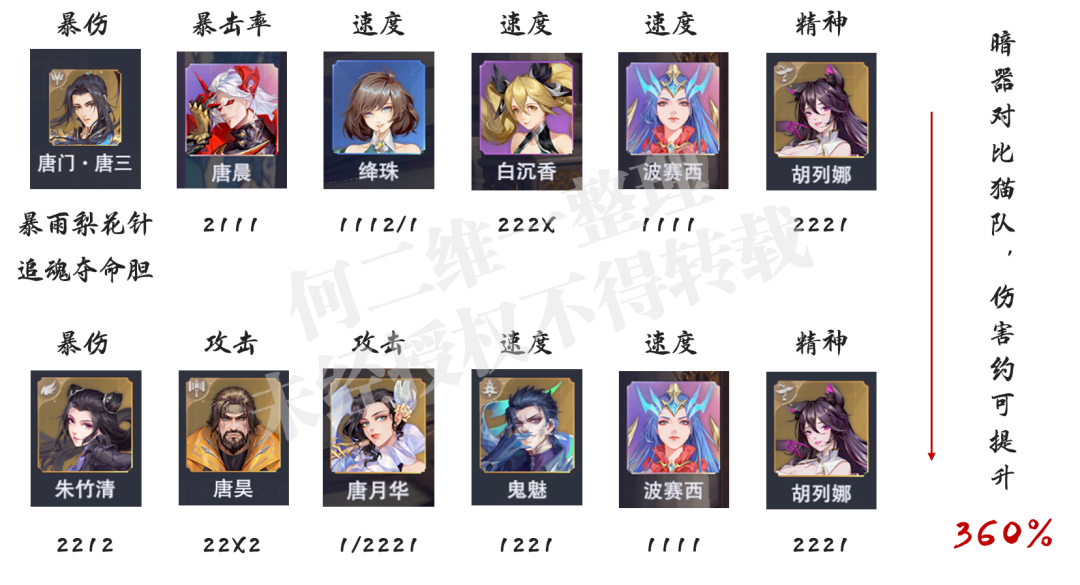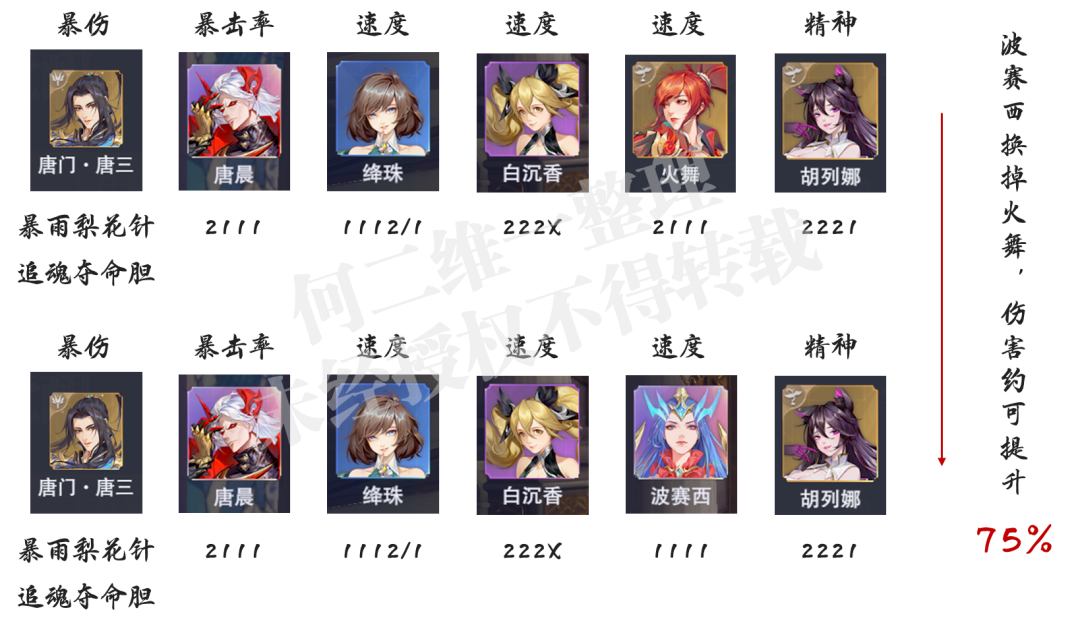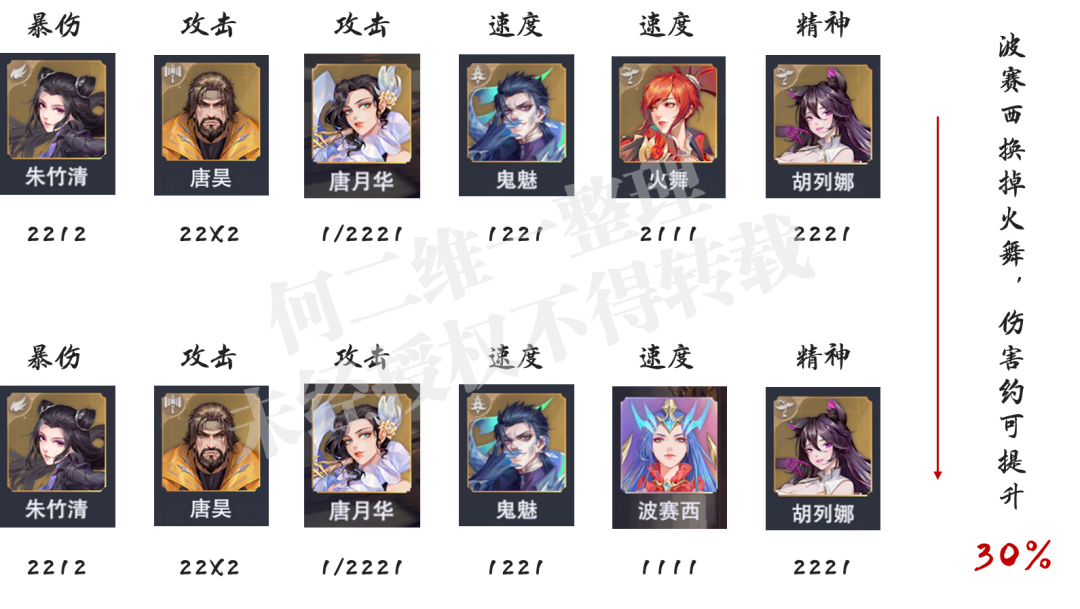 首先是波赛西针对唐晨暗器队的增伤提升,对比过去非常稳定的以火舞+胡列娜为双增伤核心的唐晨暗器队而言,波赛西+胡列娜的组合可以将最终伤害提升约75%左右,这个提升幅度也是极为客观的,并且波赛西并不需要太高的星级,这里也再次重申一下这个提升背后的原理: