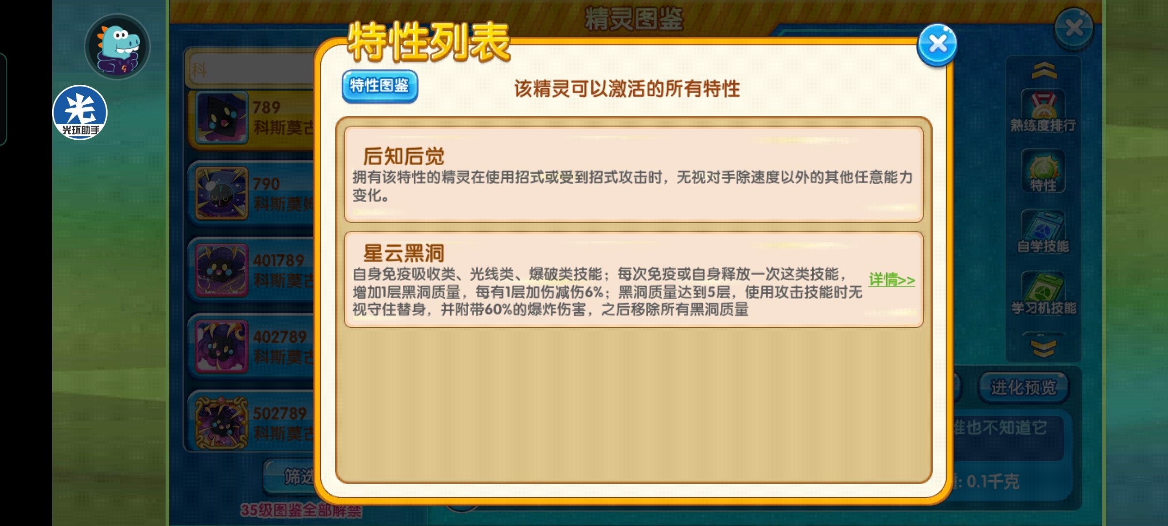 小星云有两个特性,分别是后知后觉和星云黑洞。其中,后知后觉无视速度以外任何能力的变化,在辅助方面能起到很大的作用,可以逼退强化宠,防止对方推队。