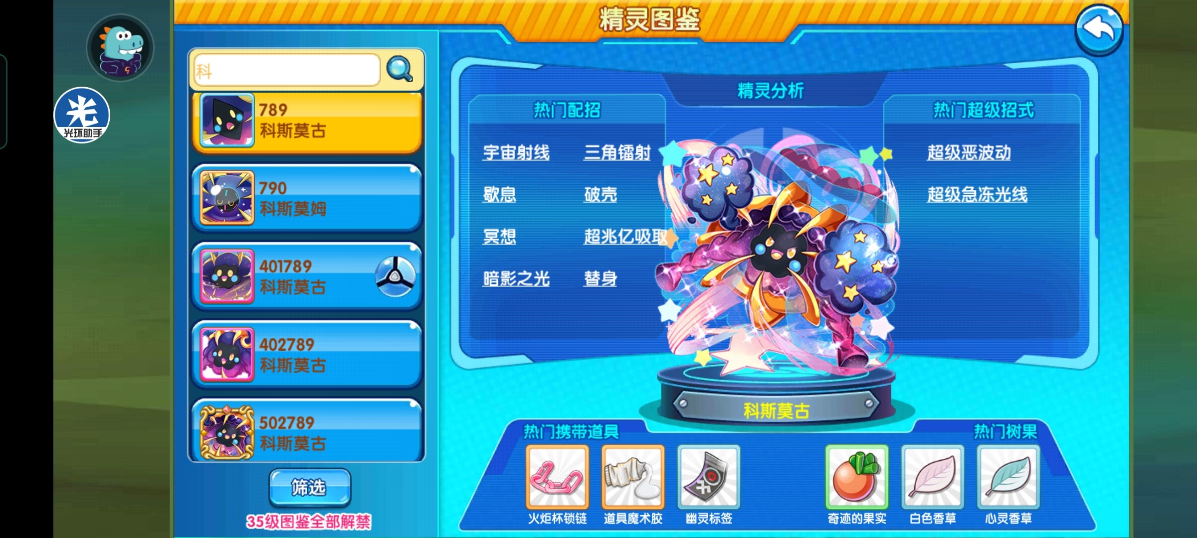 在配招方面,主要选择了歇息、冥想、宇宙射线以及吼叫。其中,歇息为小星云提供强大的续航能力;冥想能够强化小星云特防和特攻两方面的能力;宇宙射线具有吸血的功能,为小星云提供良好的反击能力以及续航能力;最后的吼叫则可以逼退对方的强化宠,防止对方推队。