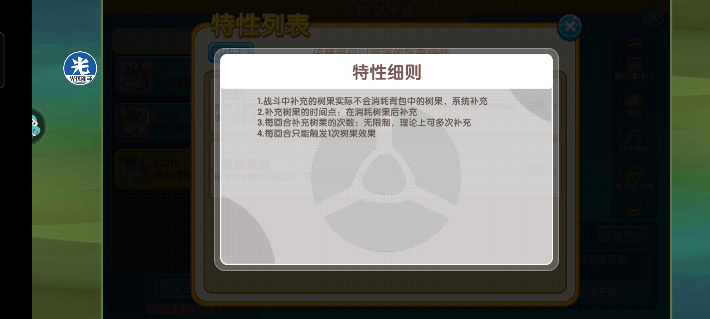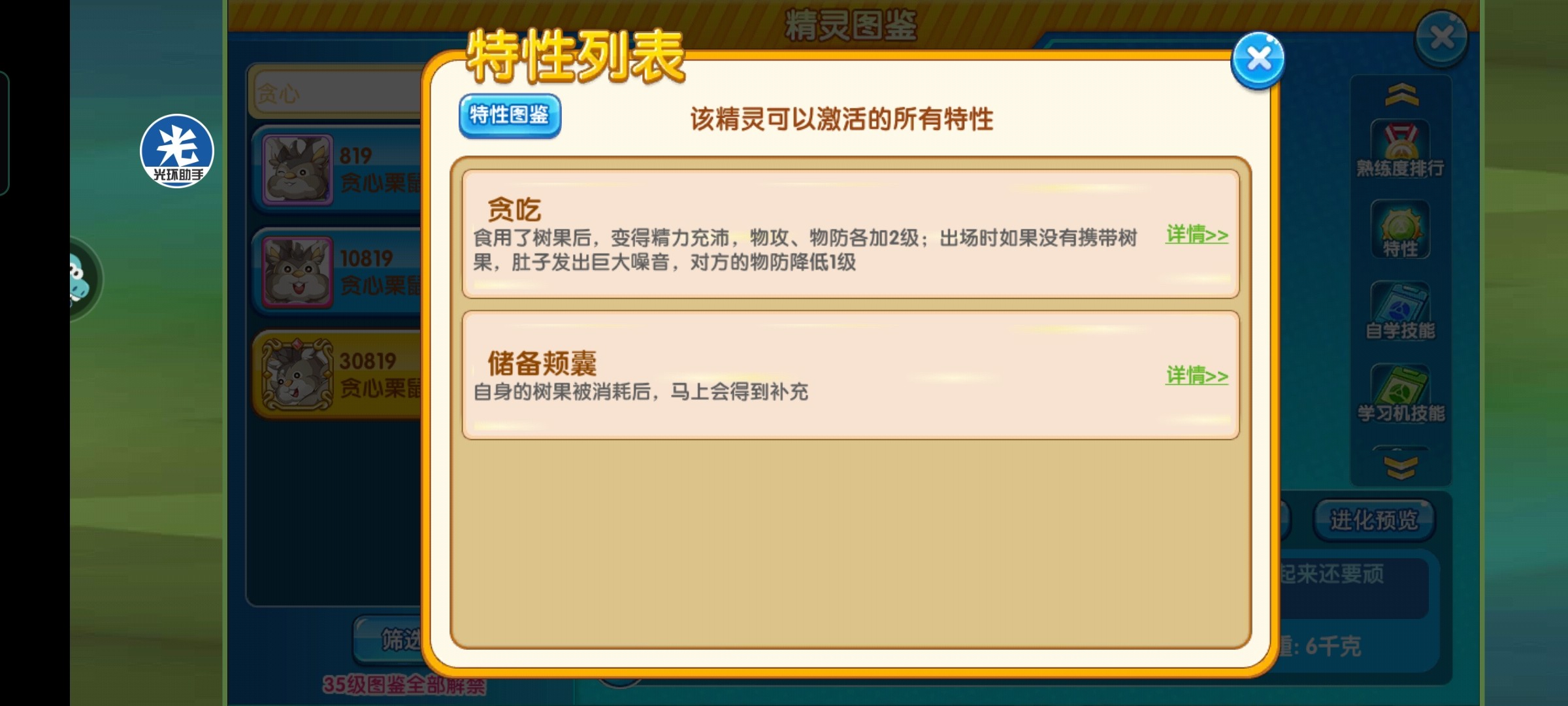 贪吃栗鼠拥有两个特性,特性贪吃和特性储备颊囊,下面对这俩特性进行介绍: