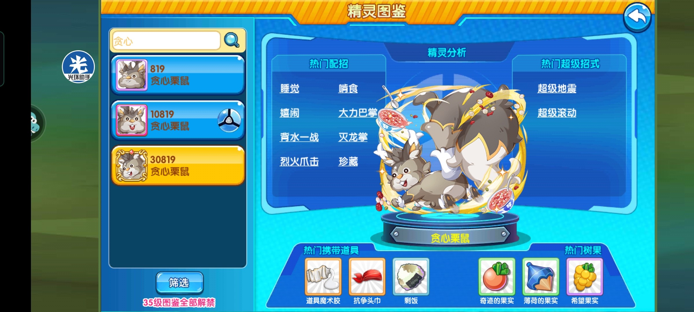 猛毒素和大力巴掌可以按照小伙伴们的队伍进行搭配。 当然贪心栗鼠的配招和树果搭配远不止这些,还需要小伙伴们挖掘哦!