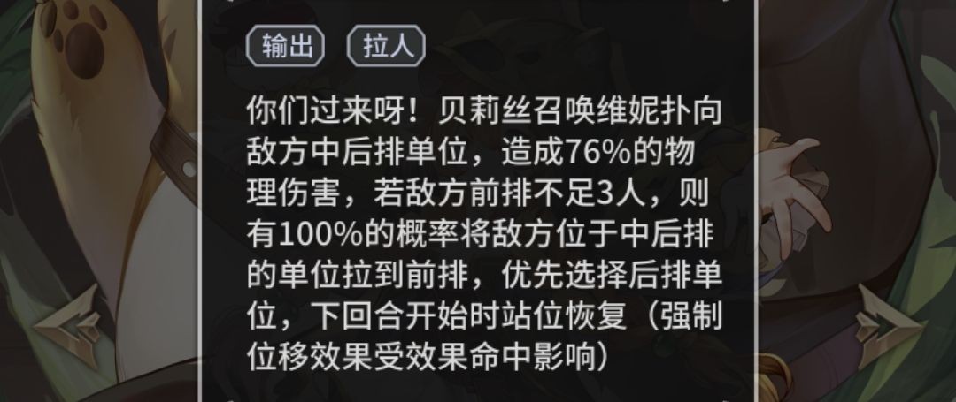 二速小熊和唐银(上图没有唐银,可供参考):小熊用于把后排的敌人拉到前排,配合风笑天消耗。并且附加印记,能对后续的单体伤害提供额外加成。