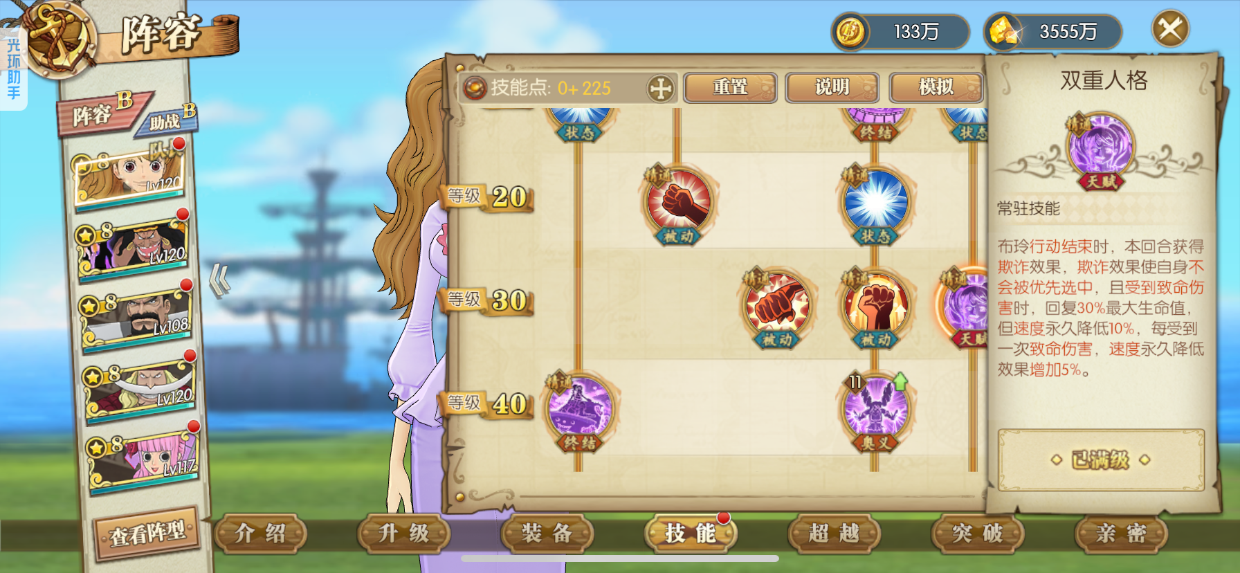 布玲行动结束时,本回合获得欺诈效果,欺诈效果使自身不会被优先选中,且受到致命伤害时,回复30%的最大生命值,但速度永久降低10,每受到一次致命伤害,速度永久降低效果增加5%。