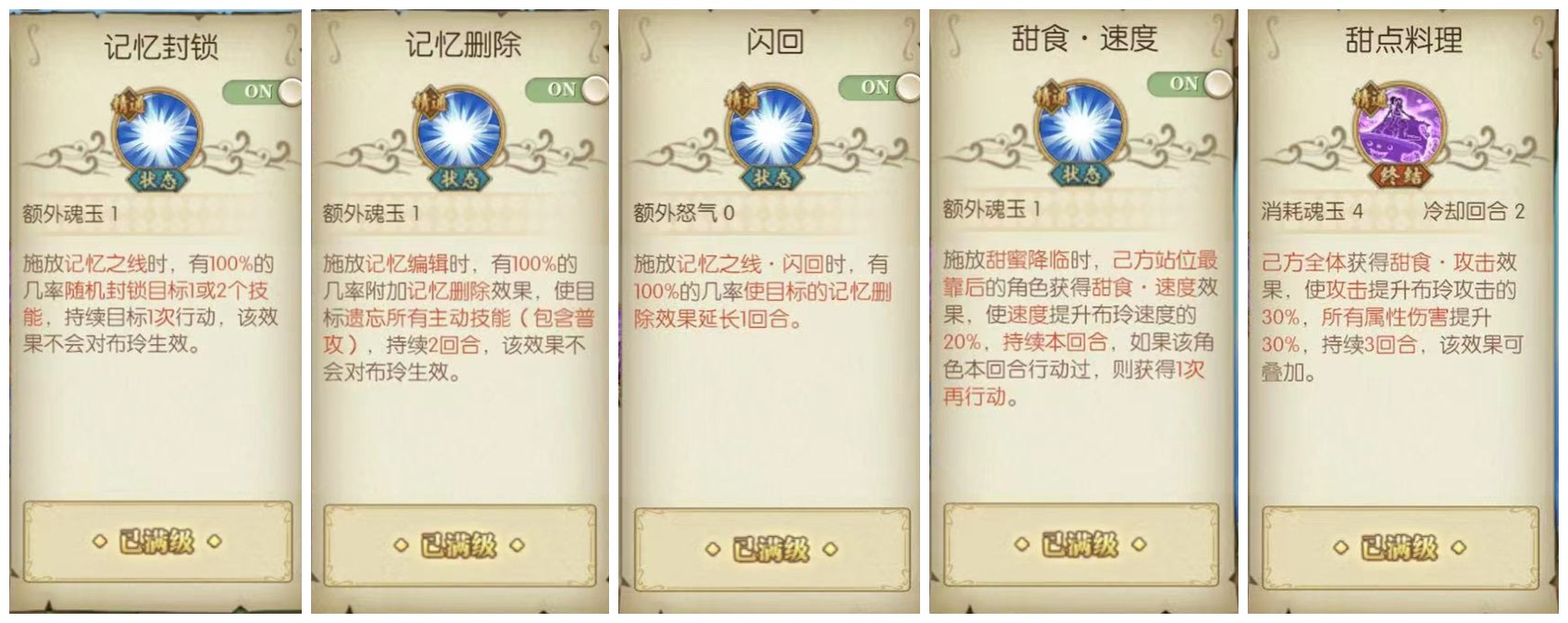 己方角色获得甜食效果时,驱散所有负面效果,并回复40%的最大生命值,大妈团的其他成员额外回复40%的最大生命值,如果布玲是首个行动的角色,行动结束时,清除终结技能冷却。