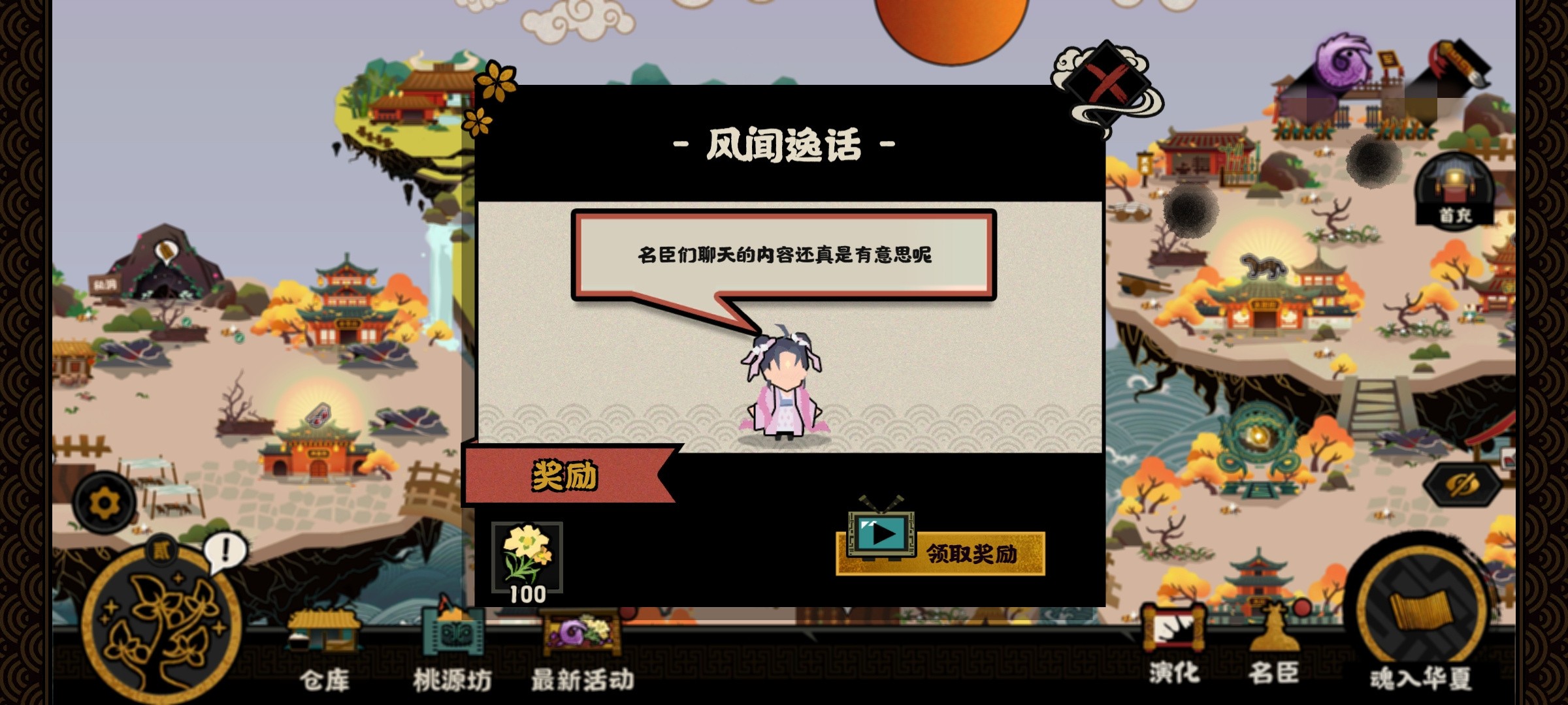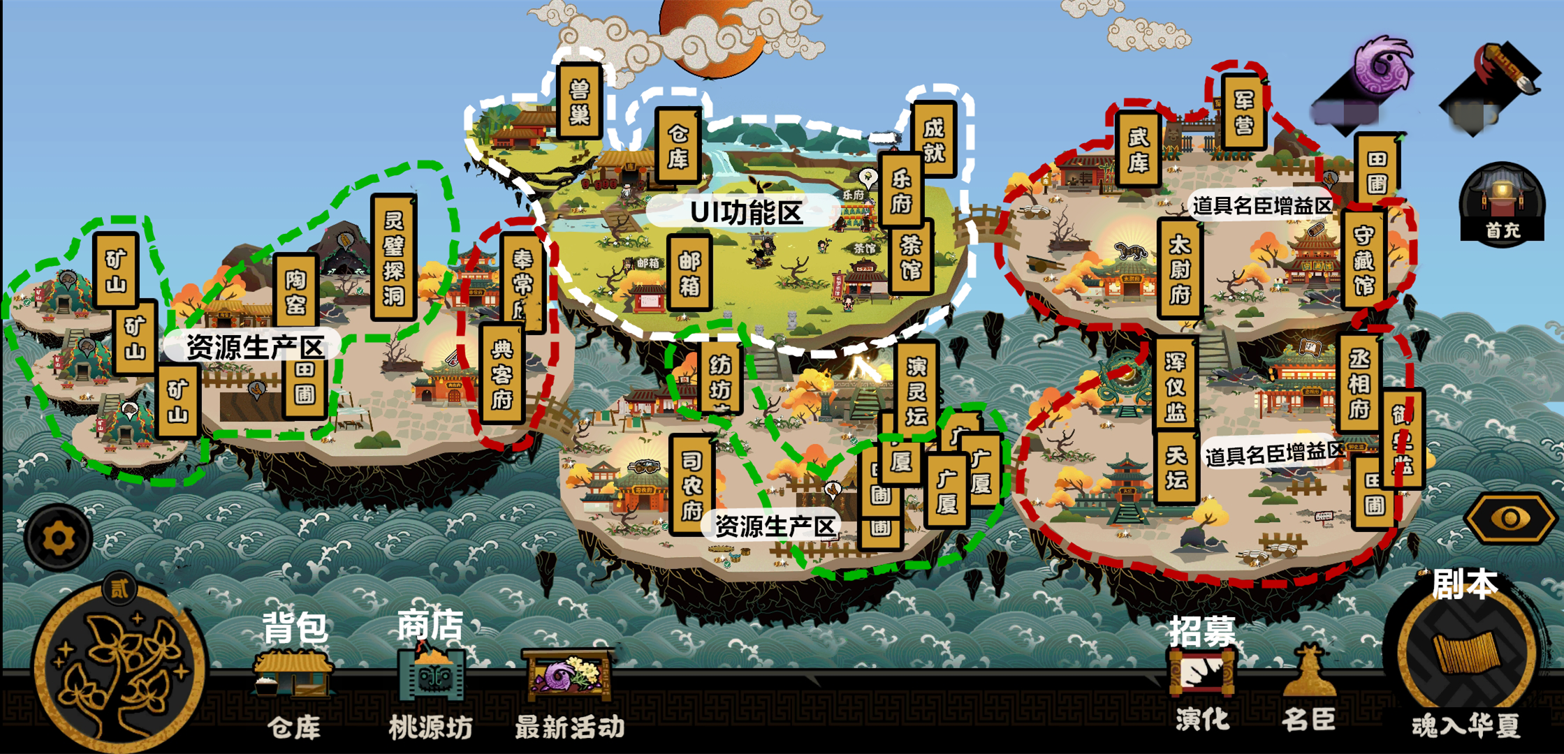 山海界内大致按功能分为UI功能区域、资源生产区、道具增益和名臣提升区。UI功能区类似其他游戏的游戏主界面,像成就、仓库(背包)、官方活动咨询都在这里,而资源生产就是经济基础,只有这些发展起来了,才能提升道具和名臣这些。