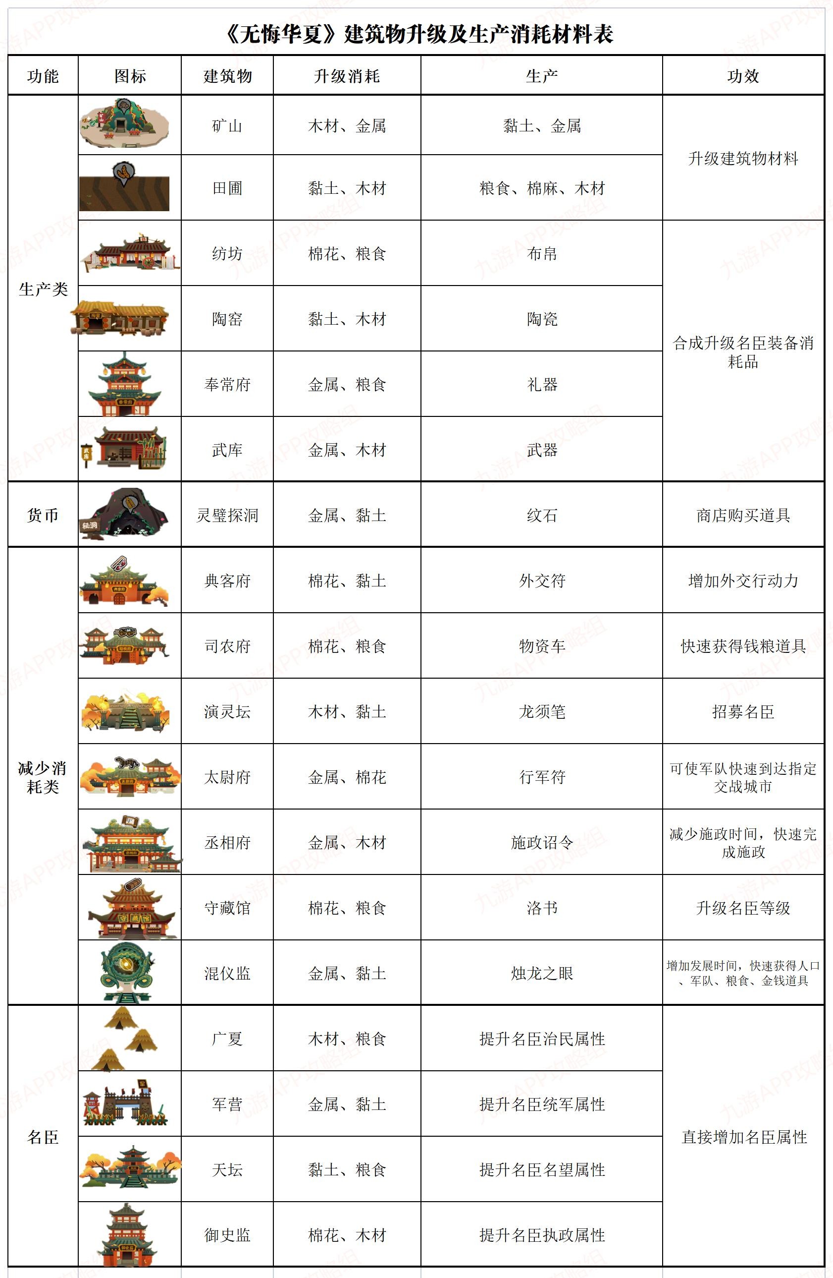 演灵坛,这个出龙须笔,可招募名臣,因为升级所有建筑物都有名臣总星级(所有名臣的升星等级相加)的限制,所以名臣数量一定要多。司农府、混仪监能在华夏中快速获取资源(每局最多可累积使用10次),资源在华夏征战中非常重要,然后守藏馆,能产出升级名臣等级的材料,可以稍微还一些,因为前期名臣还不确定要用哪个,没必要有一个升一个。其他道具类可以不用升级,这类加速施政、加速行军的道具用处相对小些。