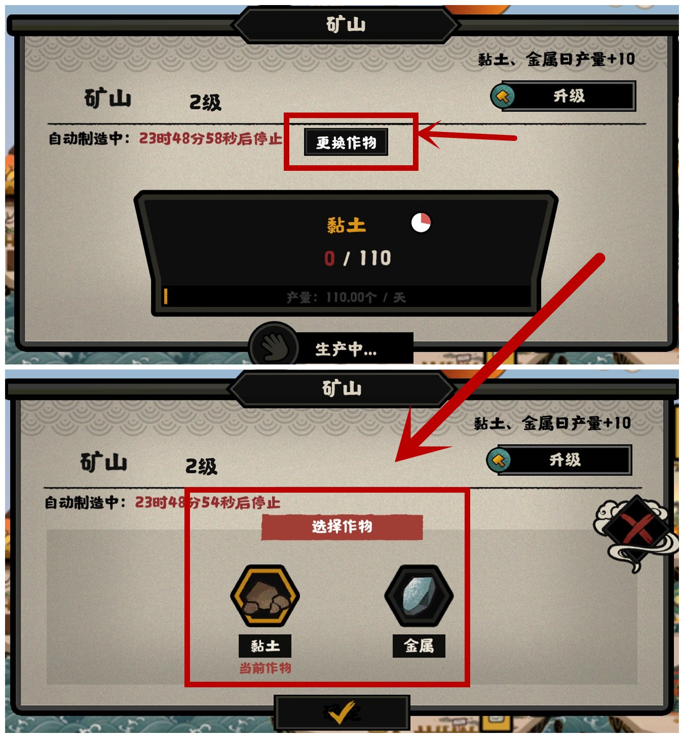 1、矿山和田圃点击生产页面,可切换生产的材料,也可直接降地图放大,点击矿石、木材这些点,也能采集。