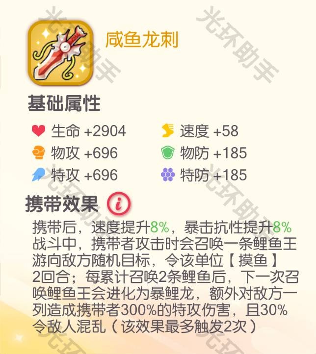 这个橙携不算通用,是玛纳霏的专属,但由于原始盖欧卡也能触发该橙携的全部效果(客服表示原始盖欧卡召唤的鲨鱼也属于召唤物),所以可以考虑,但是具体效果不清楚,目前这个橙携存在bug,召唤鲤鱼王经常失效且暴鲤龙没伤害,所以要入这个咸鱼剑的话可以暂时不开箱子。(并不代表这就是原始盖欧卡最适合的橙携,效果也不清楚,只是说可以等修复观望下,大鱼究竟带什么要等周日做出来测试才知道哈!)