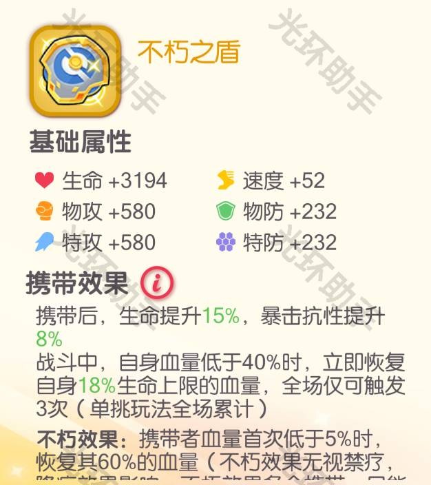 比较通用的防御橙携,多次大量回血,能够大幅提升携带者的生存能力。原固首选,其他精灵只要想活得久都可以带。 之前扭蛋可以花钻石买,遭到玩家批评以后的扭蛋应该都不会再出这个携带了。