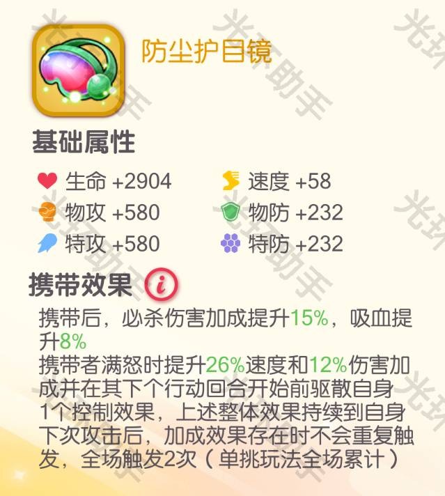 之前由于版本节奏快所以效果不好,目前慢节奏版本属于最强输出携带,且为通用携带很多精灵都可以带,伤害加成相比护目镜和两回合后的金剑要高出很多。 唯一缺点是没有开局加速,加速是中途给的,在快节奏版本里效果偏差。