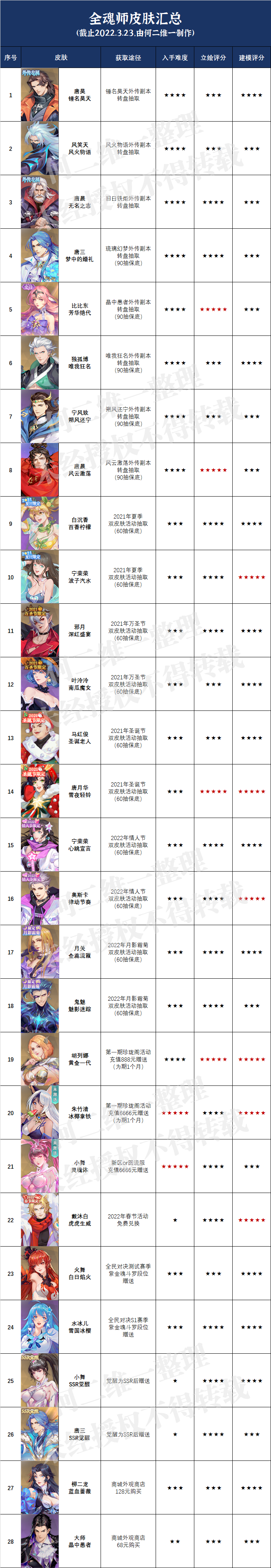 · 上表中的入手难度基本上就是指获取这款皮肤所需要付出的成本,其中由于钻石、人民币等等资源与抽取概率的问题,这里只能用大致的标准来进行评判,例如5星获取难度的皮肤维一给到了两款需要充值到6666元才能获得的皮肤,而4星获取难度的皮肤则普遍给到的是外传副本中通关转盘获取的皮肤,因为这个转盘的保底数大致都是90抽,而想要抽到90次我们所付出的钻石成本也是非常高的,此外还有胡列娜充值888元赠送的皮肤维一也是给到了4星的获取难度;而3星获取难度维一则普遍给到的是双皮肤抽取活动,这个活动中的第一个皮肤所付出的钻石还行,第二个可能就有点高了,不过综合而言还是3星;之后的2星、1星则基本是赠送或者低成本充值获取了