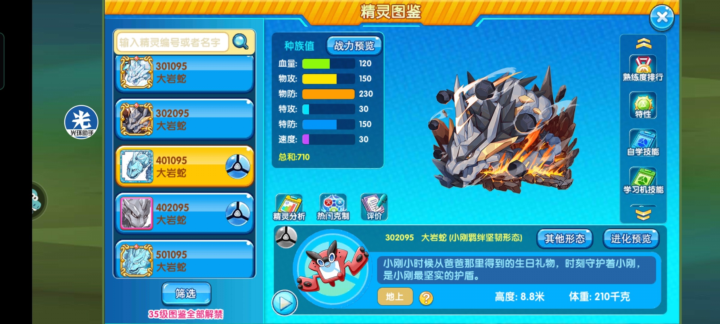 前言:大岩蛇属于第一世代登场的精灵,以岩石系道馆训练家小刚的大岩蛇出场最多,大岩蛇的身体由多块巨大的灰色岩石构成,形似于蛇,从中段到尾部的岩石越变越小。它的头顶有一根岩石长角,下方则是一双黑眼睛,复刻中小刚羁绊大岩蛇属于氪金形态,不过以前在周年庆活动有过一次白嫖活动,当时参加拿了,没想到如今终于迎来新形态,我也最快进行mega,给大家带来实战视频,先让我们一起来看看它的图文介绍吧。