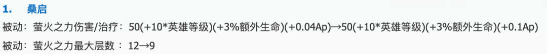 此次官方对其调整等级加成以及额外的生命值加成不动的情况下,AP加成由之前的4%调整到了10%,其次是在被动方面进行了削弱,萤火之力最大层数由之前的12层调整到了9层。这样调整就是降低了其一技能爆发的伤害,但又给你加了单次伤害的能力。