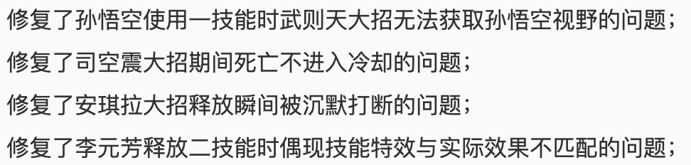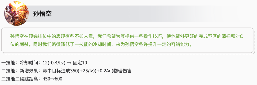 此次更新首先猴子修复了在使用一技能的时候武则天三技能无法获取孙悟空的视野问题,其次是一技能冷却CD由之前的12/11.6/11.2/10.8/10.4/10s调整到了固定的10s,最后是二技能增加了个命中目标造成350+20%AD加成伤害,然后二段跳的距离直接增加到600。此次调整之后猴子估计要去一线地区打野了,此次调整是加强。
