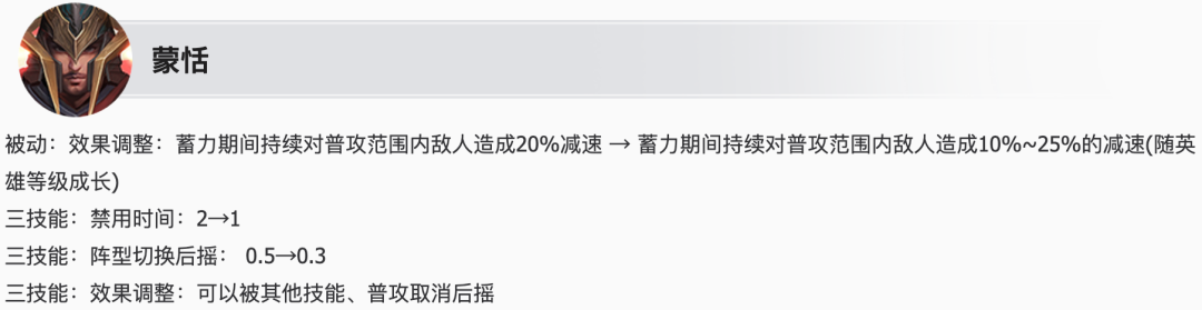 此次官方对其调整被动在蓄力的时候对普通攻击范围里的目标造成减速效果由之前固定的20%调整到了10~25%,其次是三技能禁用CD由之前的2s调整到了1s,而且阵型切换之后后摇CD由之前的0.5s调整到了0.3s,后摇可以通过普通攻击以及其他技能来取消。此次调整之后整体强度是有些提升的。