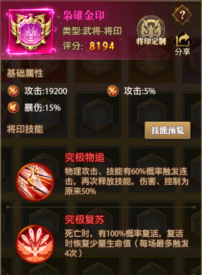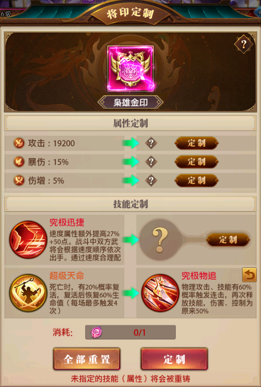 对于洗练不出想要属性的主公,通过究极技能玉去定制自己需要的将印,是个不错的选择。