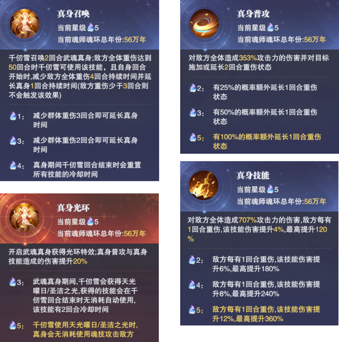· 【真身光环】额外为千仞雪提供了一个全新的输出技能,同时在彩色5星的支持下,【真身技能】还能更高频率的使用,提升千仞雪的总输出量