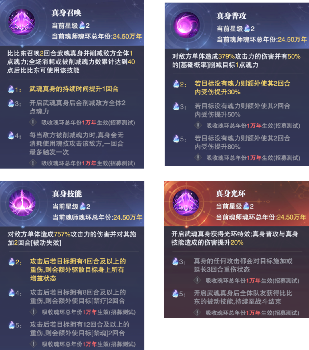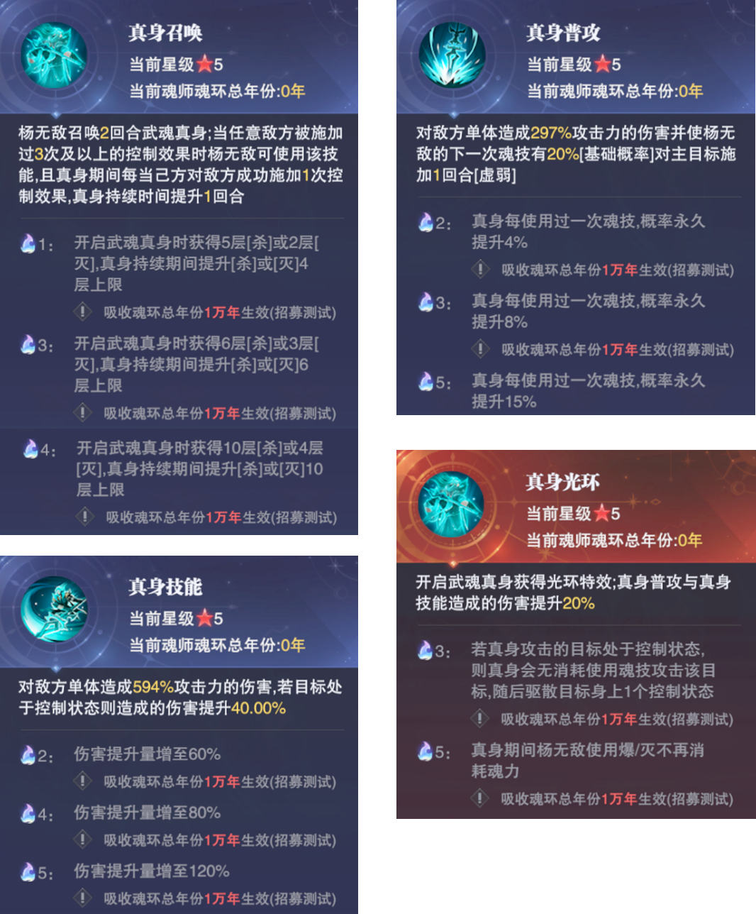 · 武魂真身中4个技能的强度与原魂师所在魂环的总年限有关,总年限越高则每个武魂真身技能的效果越强