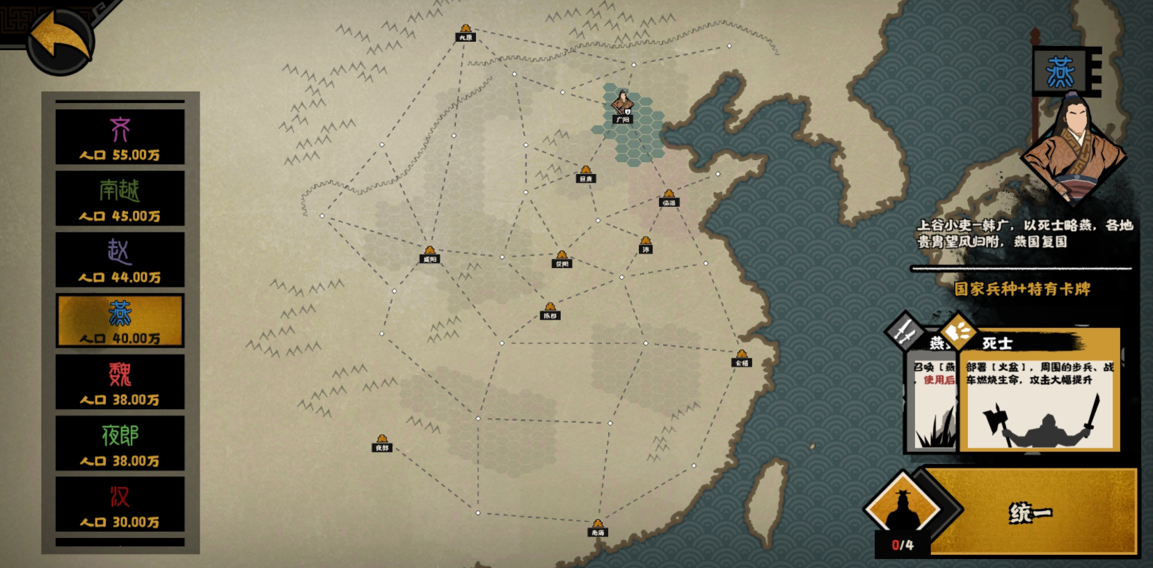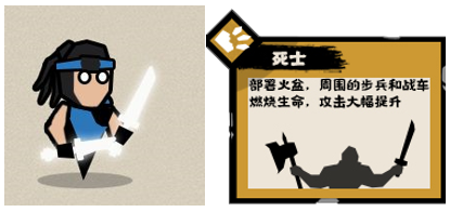 燕国的特殊兵种是燕死士,战斗力极为强大。技能卡为“死士”,使用会部署火盆,周围的步兵和战车燃烧生命,攻击大幅提升。