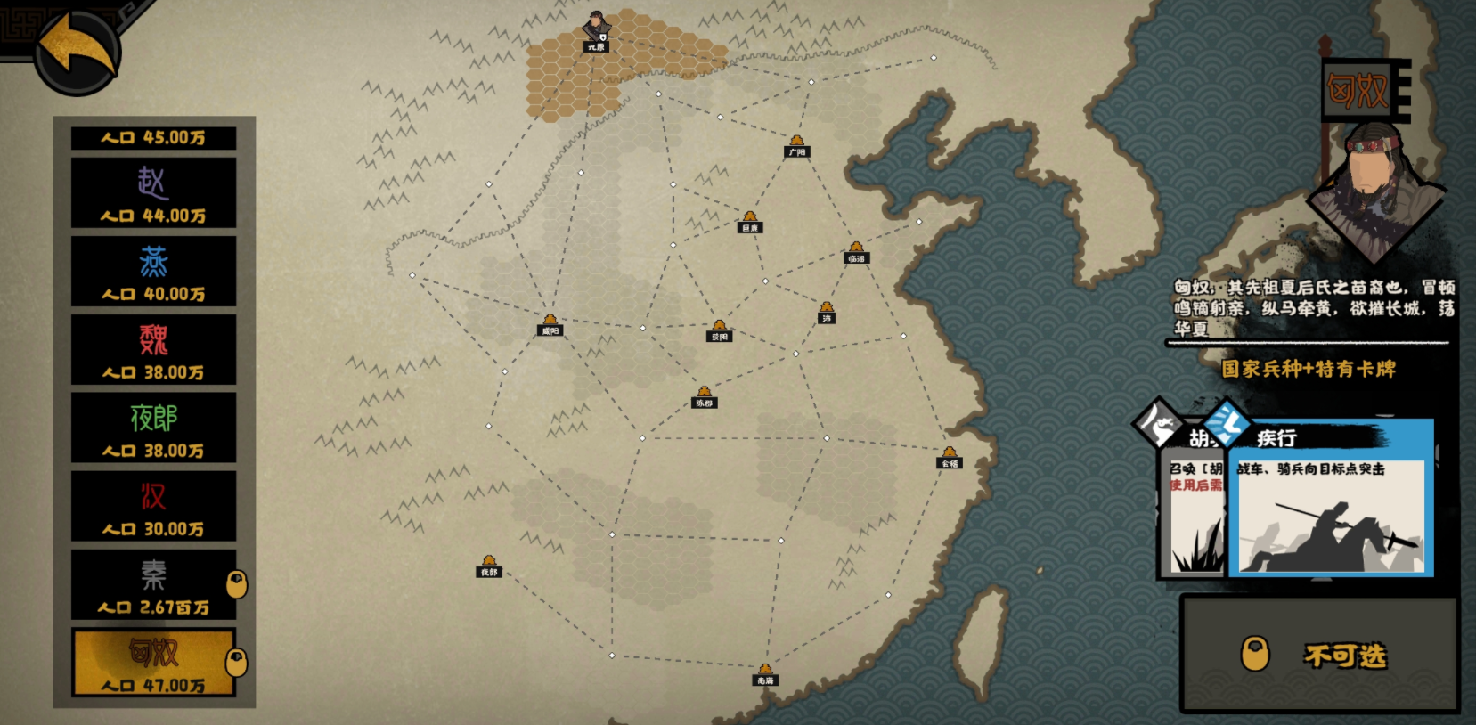 匈奴的特殊兵种是骑兵,游牧民族伴马而生,疾风骤雨。技能为“疾行”,可以使战车、骑兵向目标点突击。
