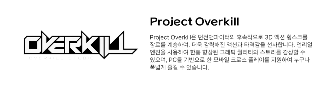 官方描述:《Project OVERKILL》为《地下城与勇士》的续作,继承了原作动作的3D横版游戏类型,并具备更强大的动作体验和打击感,将采用虚幻4引擎架构 ,玩家可以感受到虚幻引擎带来的进一步画面提升和故事体验,支持以PC平台为基础的移动跨平台游玩,沿用经典原作世界观,达成从2D至3D的全新转变,以全新的视角向玩家展现神秘而焕丽的阿拉德大陆。