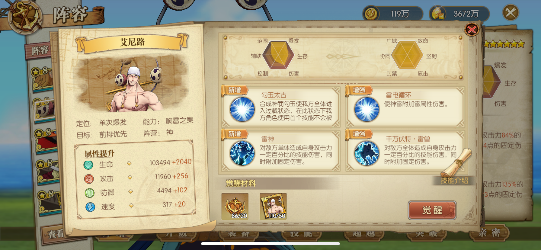 觉醒图中了解雷神能多次复活、觉醒过后能给团队其一队友免移除,被敌方技能命中团队时有几率麻痹敌方,觉三后能有单体移除技能,觉醒2后基本满足雷神的团队辅助的效果,并团队人员首个技能能无视中断与控制效果,大大保证人员出手与释放奥义。所以艾尼路觉醒2就能好好的体验了,不过艾尼路还是需要高速出手才能带来更好的辅助效果。