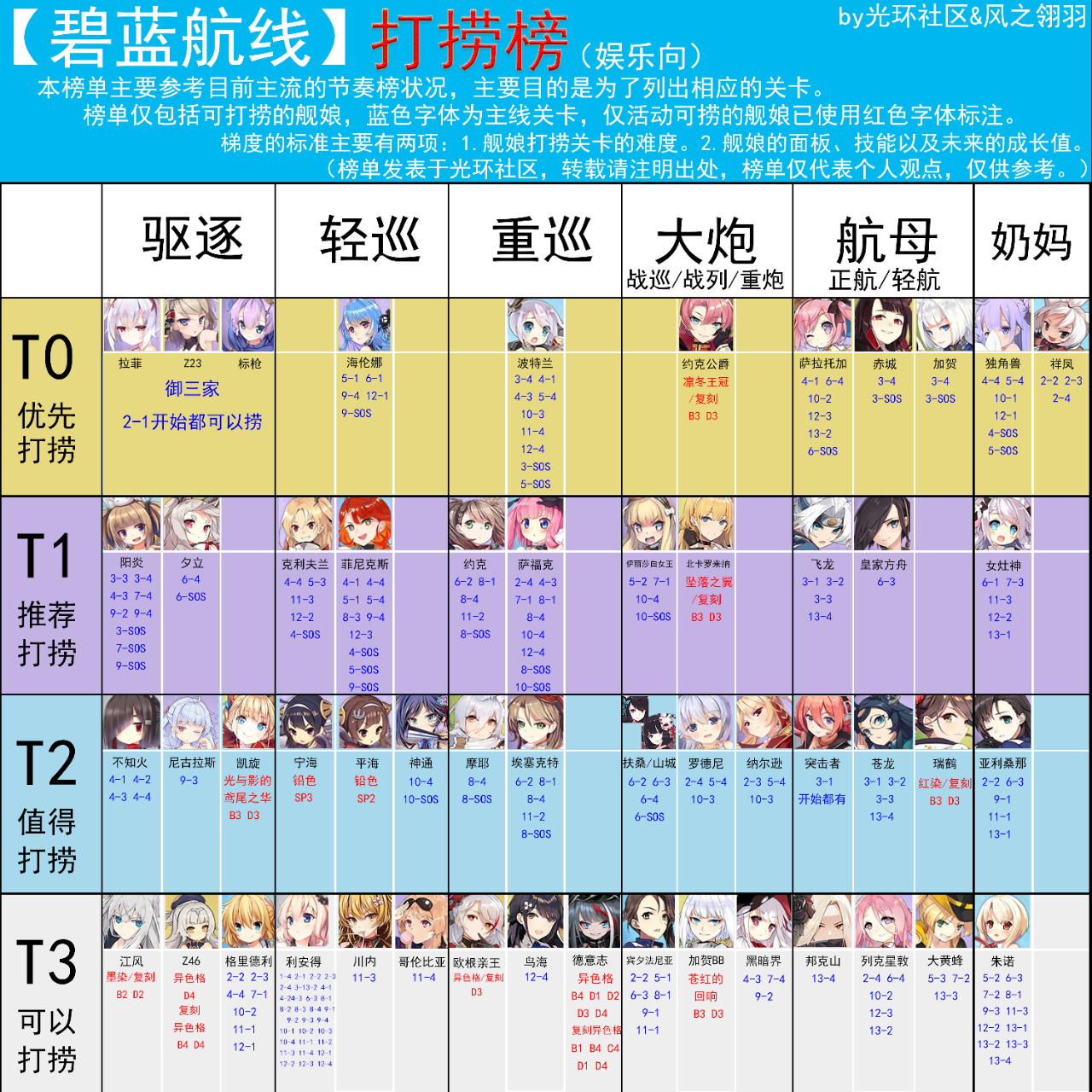 你可能看过各种强度榜、节奏榜之类的东西,知道舰娘也有强有弱,但是看过之后却不知道哪里可以入手自己想要的舰娘,这张打捞榜就是为此而准备的: