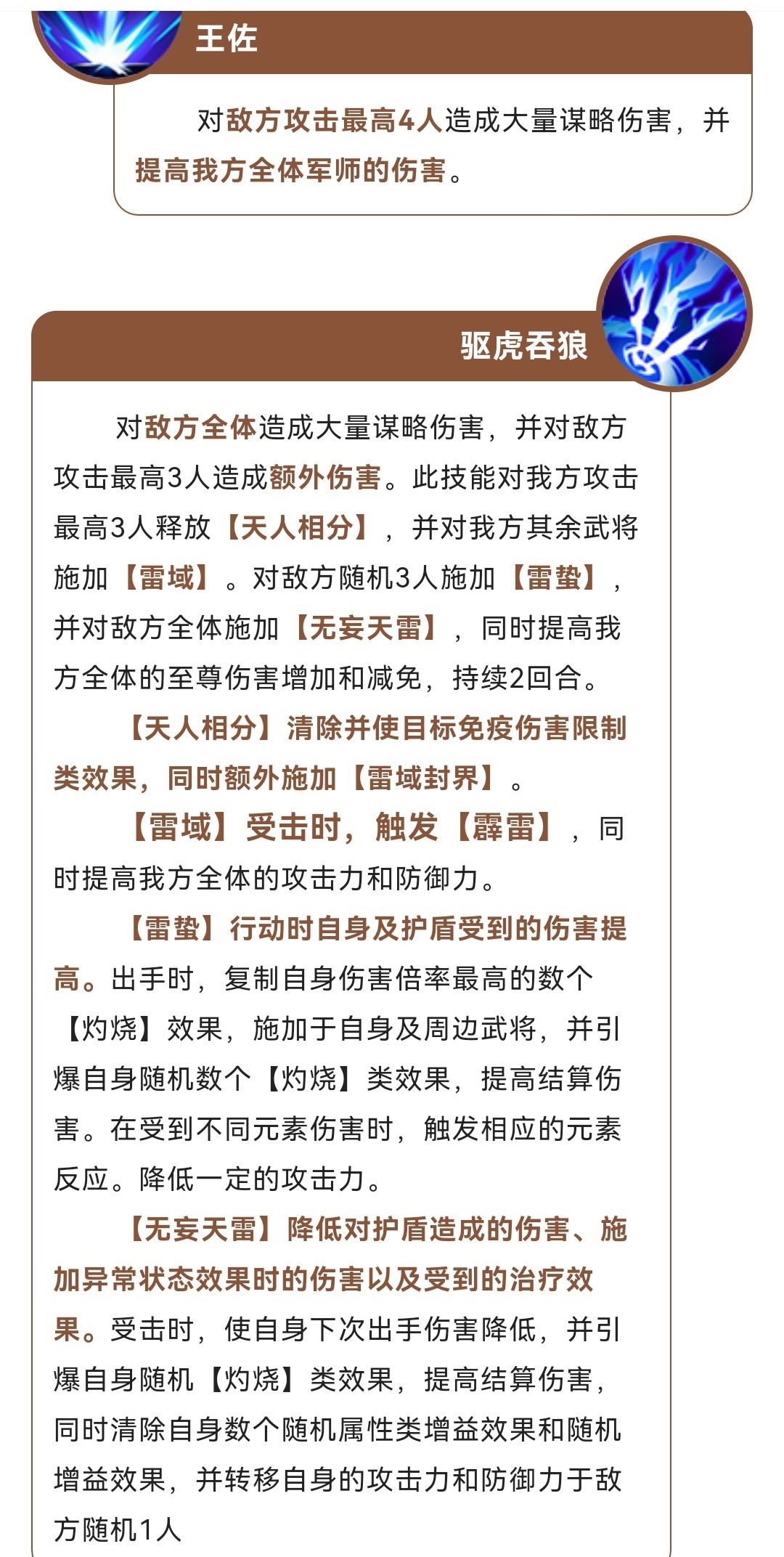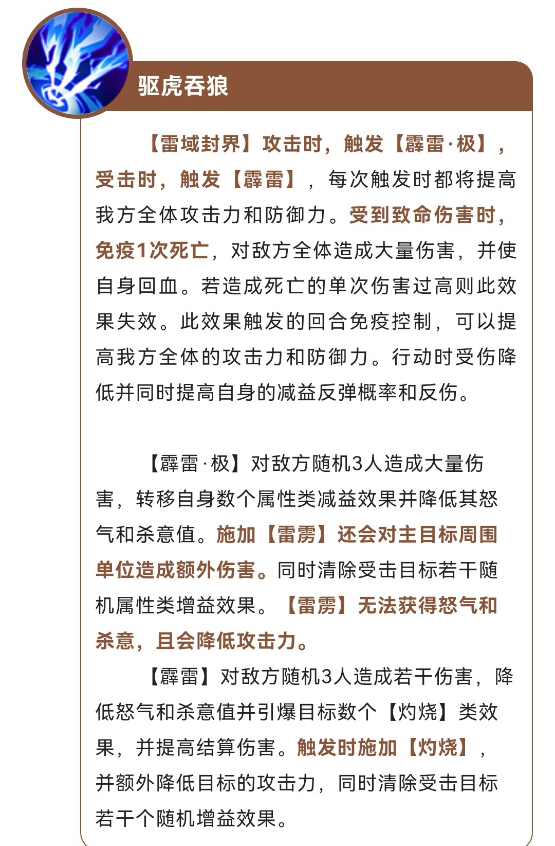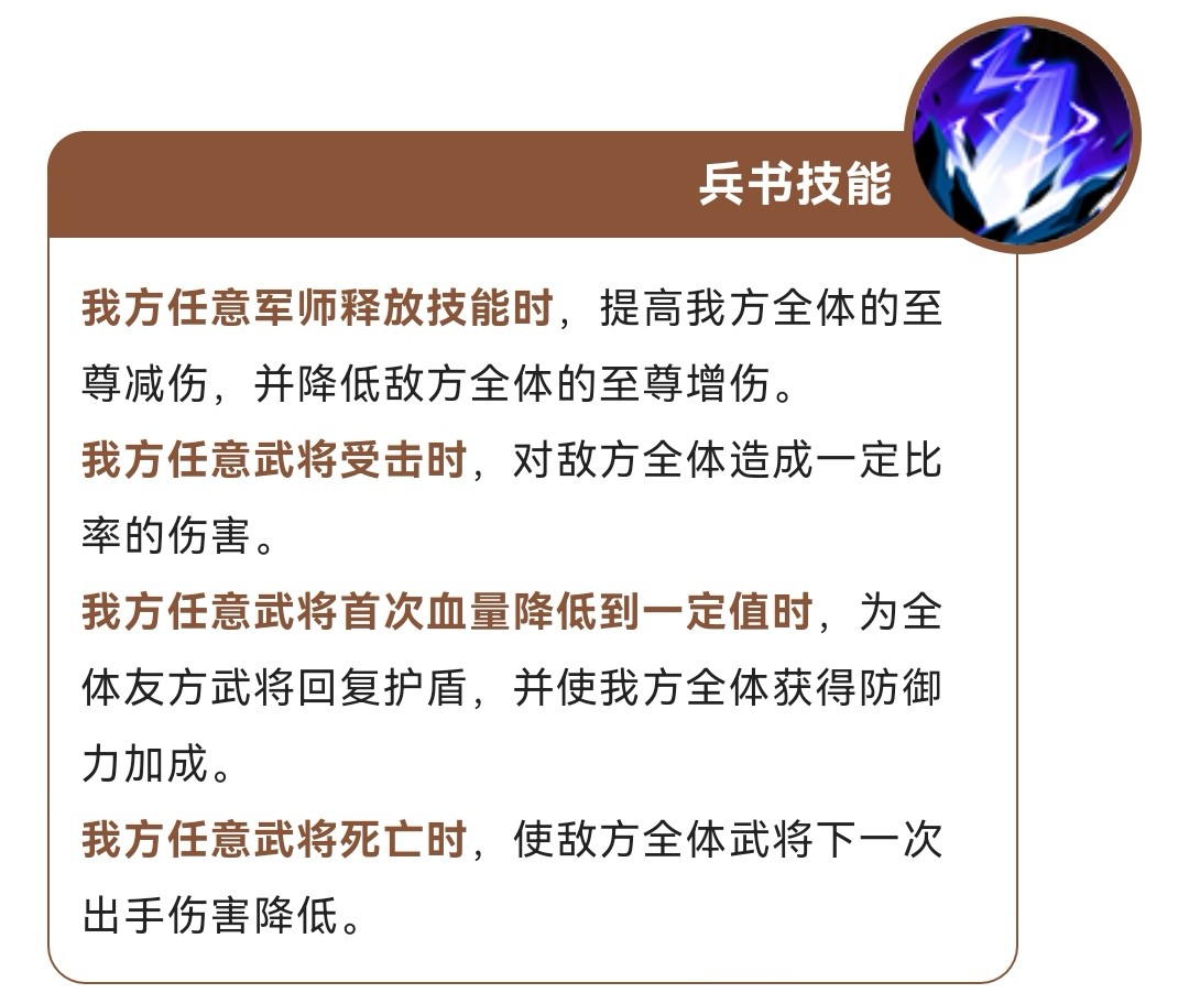 军师谋略技能-驱虎吞狼。(荀彧著名计策 使吕布刘备袁术残杀 )给敌方攻击最高的武将额外造成伤害,满级最多三个人,给我方清除控制,给敌方加大护盾伤害,还能复制敌方阵营的灼烧,给我方全体加至尊加伤减低,降低敌方打我方护盾伤害,还能触发灼烧流效果,提高灼烧伤害(策划也觉得吴国灼烧流不行?再加个强力的军师嘛)