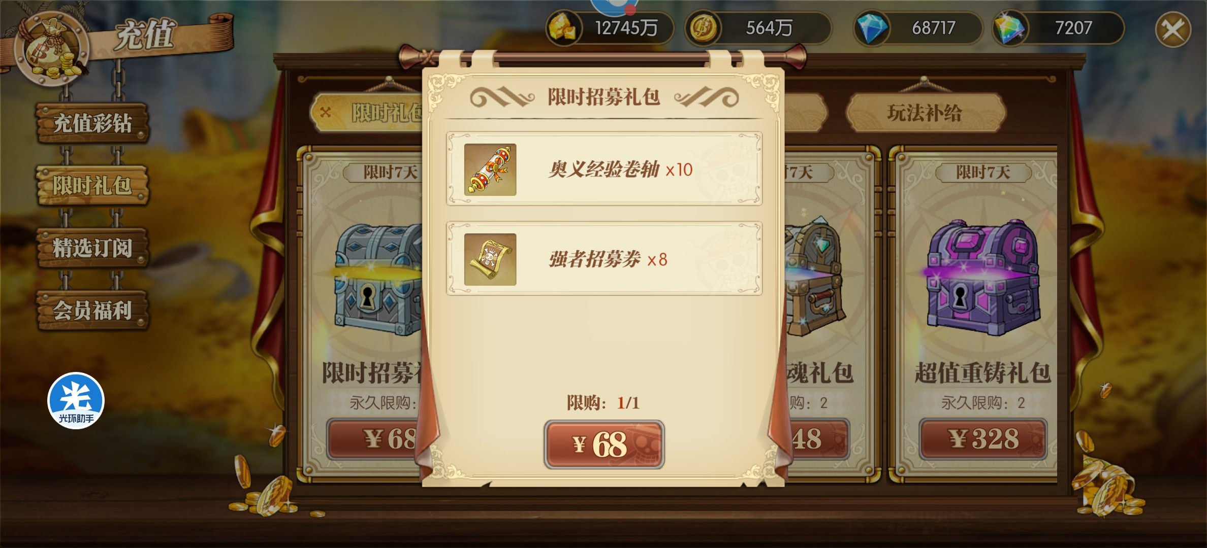 这个68块8强者的礼包是这一次新出的,结合上充值来算的话一共是10张强者性价比全是非常ok的,但是具体什么时候刷新老王表示咱也不清楚,不过在现在这个觉醒和新限定连着出的节奏来看这个礼包还是很有必要的,不然一个月500强者一般人都是扛不住的。