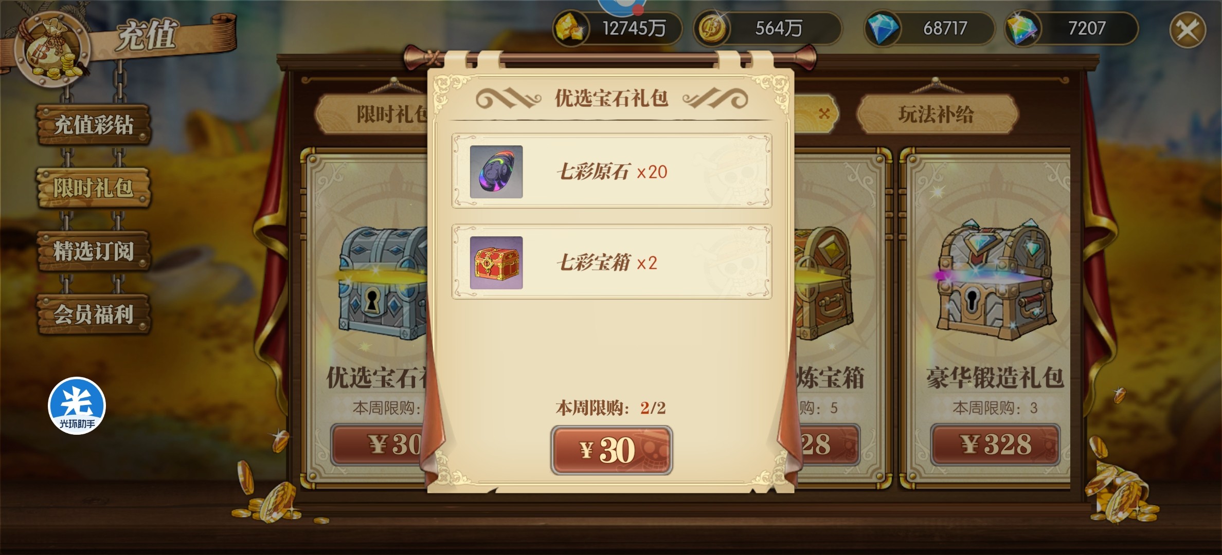 30元优先宝石礼包这个礼包怎么说呢比较看脸了,两个箱子和20原石,每周限购2次,也就是说每周4567可以买两次,剩下两次就到下周123买就行了,我们要最低价拿奖励,30块2箱子20原石2强者还行吧,没别的礼包了只能选他了。