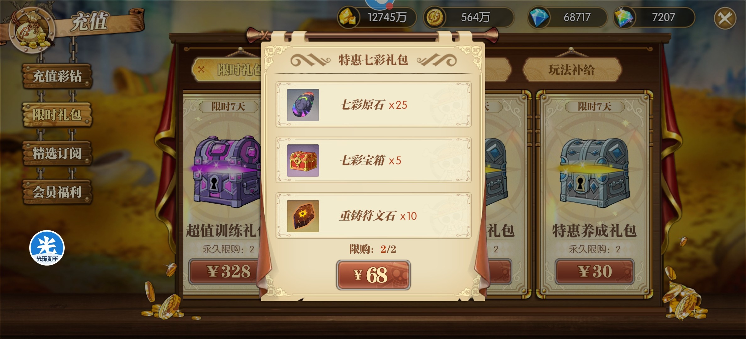 68特惠七彩礼包25原石5七彩宝箱10重铸石这个礼包老王觉得性价比就没那个30的高的,但是没办法需要6天30块肯定还有一天要68的只能买这个了。