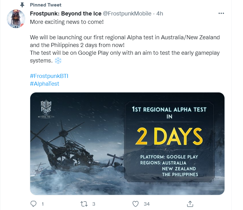 4月18日消息,《冰汽时代:最后的家园(Frostpunk: Beyond the Ice)》官方发布推文,宣布将于2天后(4月20日 )在澳大利亚、新西兰以及菲律宾开启第一次区域Alpha测试!该测试将在Google Play上进行,目的是测试早期的游戏系统。