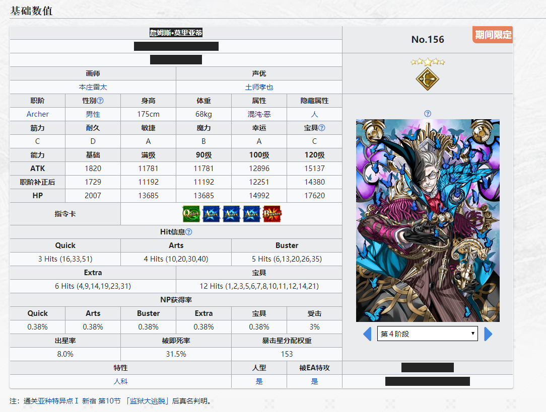 基础NP率0.38%,指令卡配卡为一红三蓝一绿,红卡5hits、蓝卡4hits、绿卡3hits、EX卡6hits,宝具为红卡单体宝具,宝具12hits,常规指令卡因为蓝卡hits高,所以NP回收中也属于中偏上的水平,三蓝的配卡更容易发到蓝卡回收NP,也更容易搭配拐来实现三蓝连携获得20NP,但缺点是红卡只有一张会拉低常规输出。