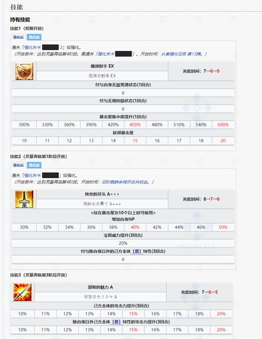 二技能经过技能本强化后变更为「蛛丝的尽头 A+++」,效果为30~50NP自充+20%宝具威力三回合+赋予自身除外己方全体「恶」特性三回合,该技能仅能在暴击星10颗或以上时候使用。